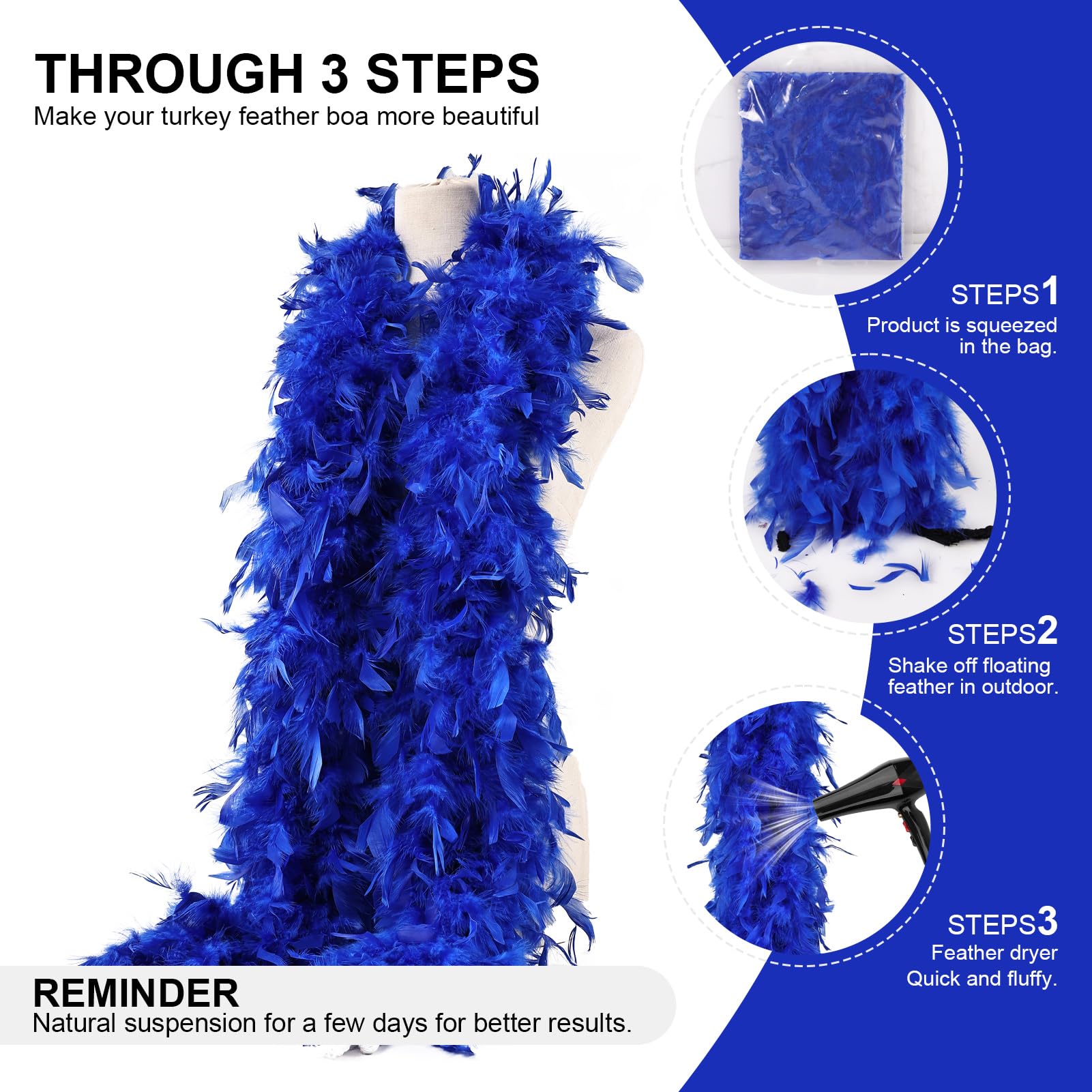 ❤️Precautions before use:Since our feathers are all natural and handcrafted,After you receive the boas, take them out of the package and shake them outdoor first, in order to get rid of debris and fallen feathers.Then hang it up for few hours before wearing. If you can hang up blowed few days, it will looks as the picture full and big.Of course,the longer you hang them up, the turkey feather boa will be more fluffy and the effect will be more stunning.