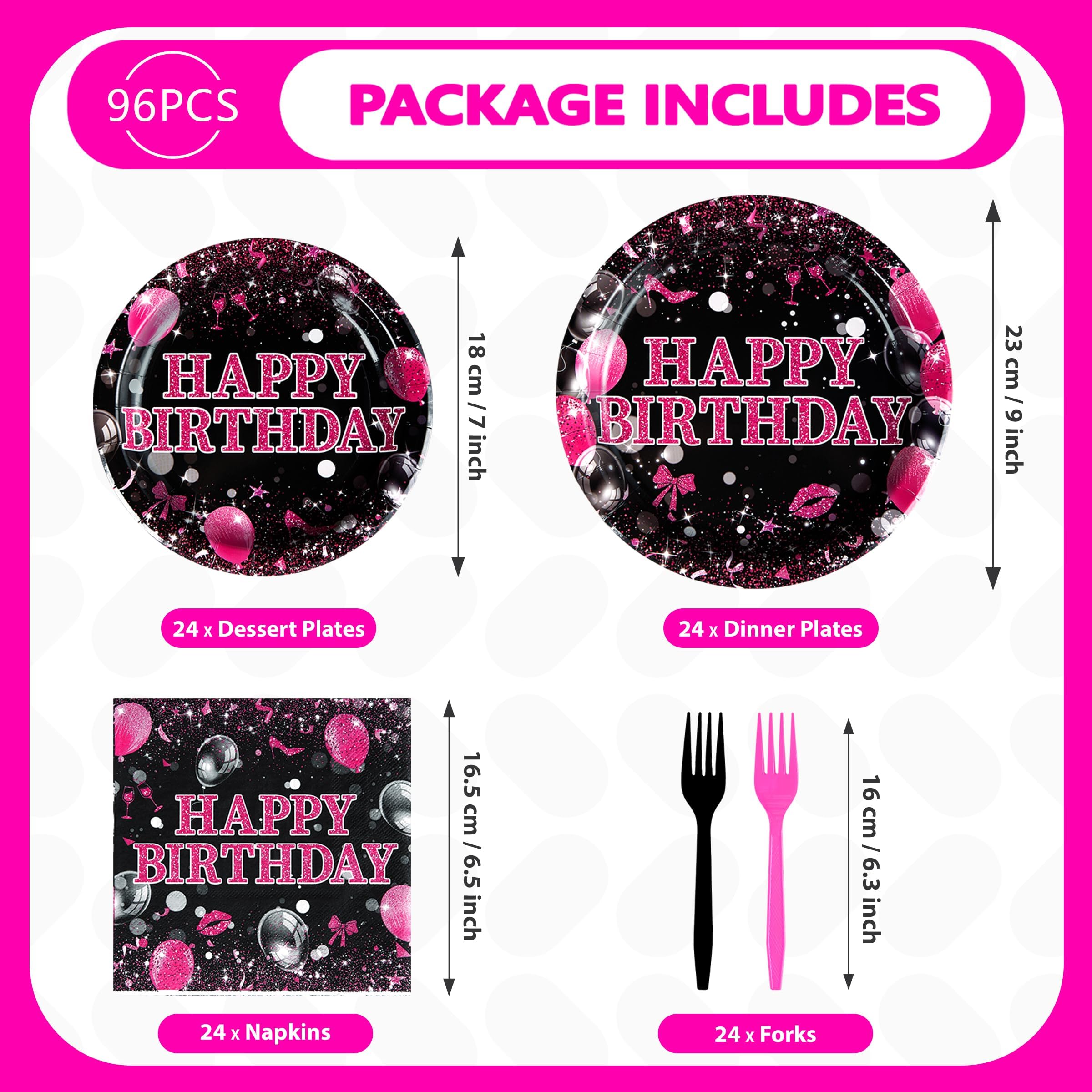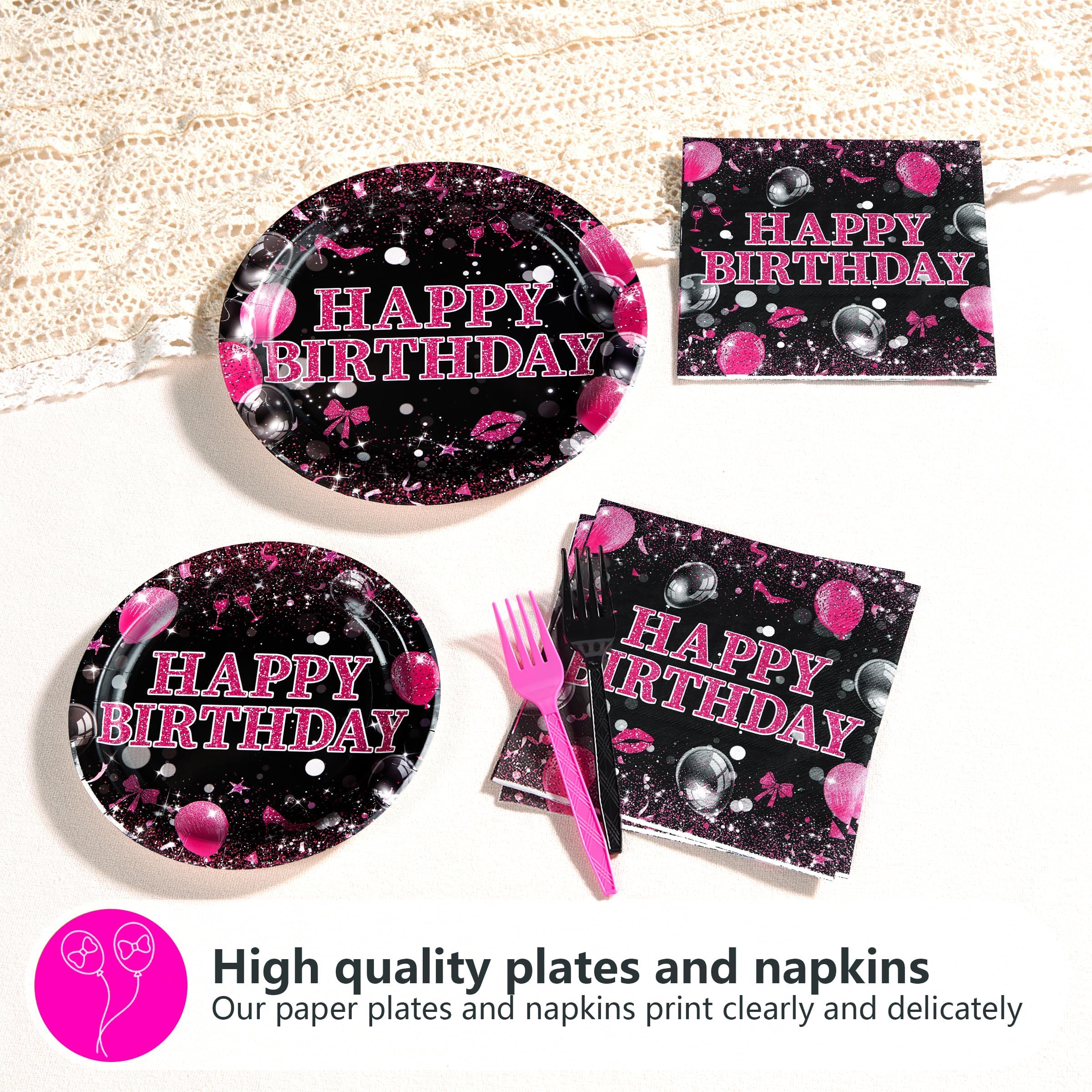 Grencian 96 Pcs Pink and Black Birthday Decorations Hot Pink and Black Party Plates Disposable Heavy Duty Happy Birthday Tableware Set for Women Girls 13th 16th 21st 25th 30th 40th 50th Decorations