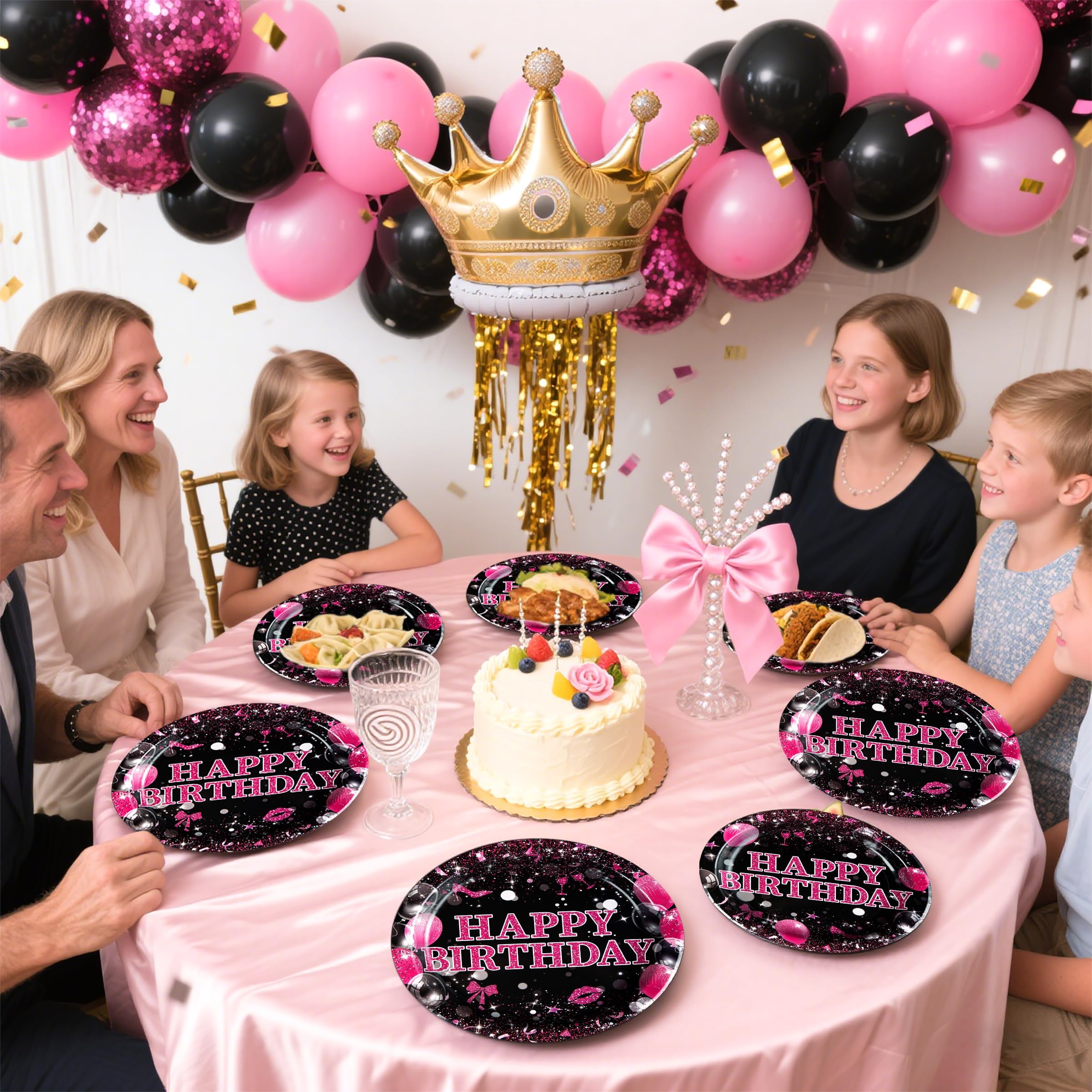Striking Contrast Design: Elevate birthday tablescapes with vibrant black-and-pink plates featuring a bold, glitter-accented “Happy Birthday” centerpiece. Inspired by trending party aesthetics, the high-contrast design pairs dramatic black backgrounds with playful pink fonts, creating a glamorous yet festive vibe suitable for adults, teens, and gender-neutral themes. The unisex palette ensures seamless coordination with streamers, confetti, or metallic balloons