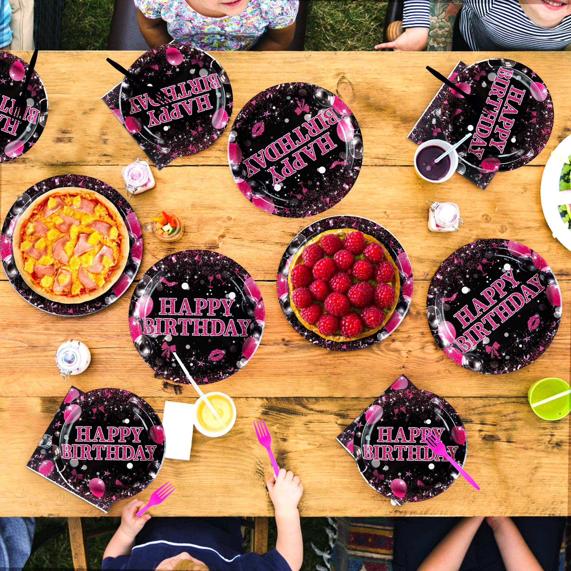 Effortless Cleanup: Say goodbye to post-party cleanup stress! Pink and black plates and napkins party supplies are disposable, after the birthday party, you can simply pack them up and throw them directly into the trash, eliminating the hassle of dishwashing and freeing up your hands so you can have more time and energy to celebrate your birthday with family and friends