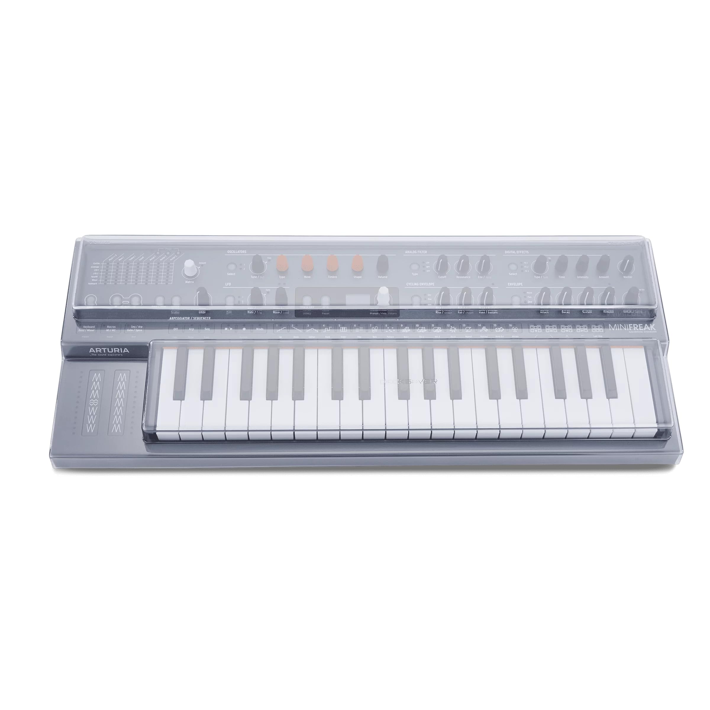 The MiniFreak is a polyphonic hybrid keyboard that unites dual digital sound engines with analog filters, playful modulation, instinctive sequencing, and rich stereo effects for sounds that are immediately curious, beautiful, and chaotic in equal measure. Designed and engineered in the UK specifically for the MiniFreak, we have created a custom-fitted Decksaver cover to protect your keyboard controller. Manufactured from our own specification of super-durable polycarbonate, a tough transparent plastic with hard-wearing qualities, this cover is an essential investment to protect this superb keyboard controller. Each Decksaver cover is designed by our team to ensure strength and rigidity around delicate pads and keys and each design is rigorously tested before it carries our name. The MiniFreak cover shields faders and controls from dust, liquid and accidental impact whilst accommodating cables, whilst its slim profile ensures compatibility with most cases and bags.