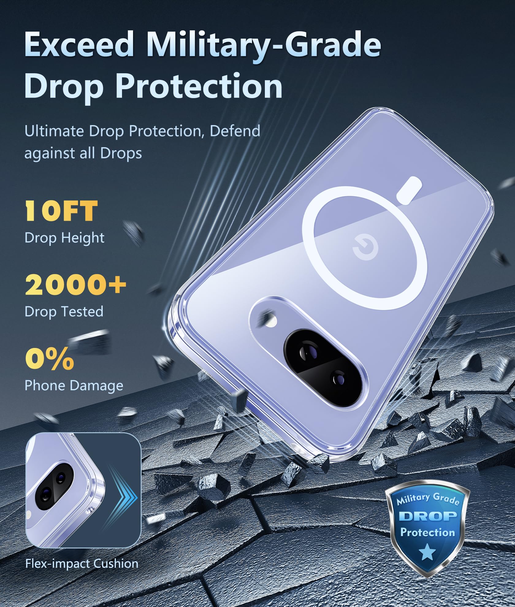 10FT Military Grade Protection: Passed Military Drop Tested up to 10 FT. This Google Pixel 9a clear case backplane is made with rigid polycarbonate and flexible shockproof TPU bumpers around the edge and features 4 built-in corner Airbags to absorb impact