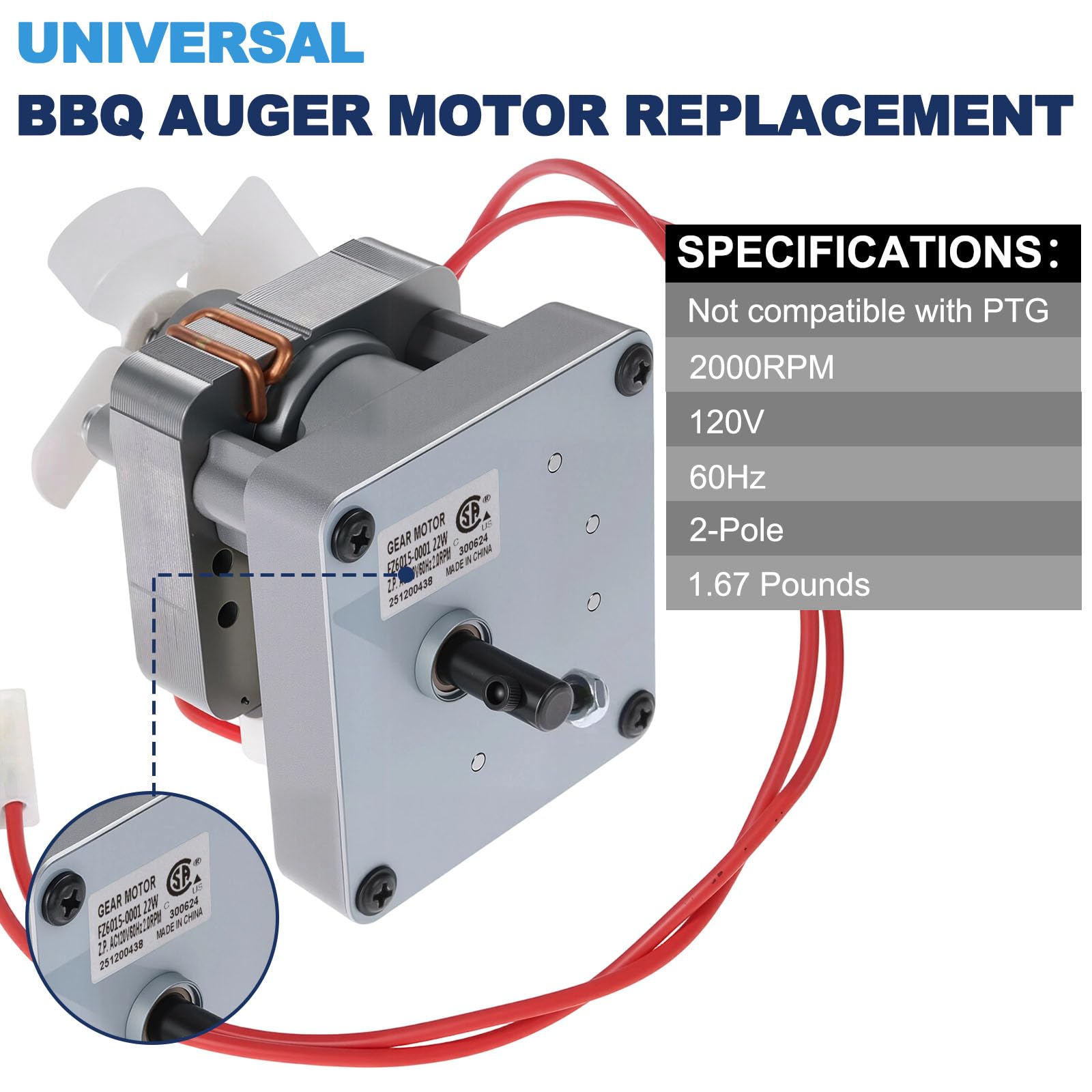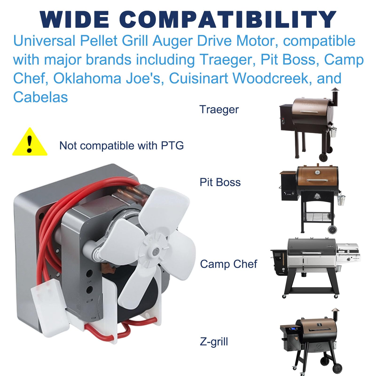 WIDE COMPATIBILITY: 2.0 RPM Auger Motor Replacement Partsis compatible with all Traeger, Pit Boss (except PTG) and Camp Chef, Oklahoma Joe, Cuisinart WoodCreek and Cabelas pellet grills. Suitable for Camp Chef smoker grills. Note: The above brands and any associated models are for compatibility demonstration purposes only