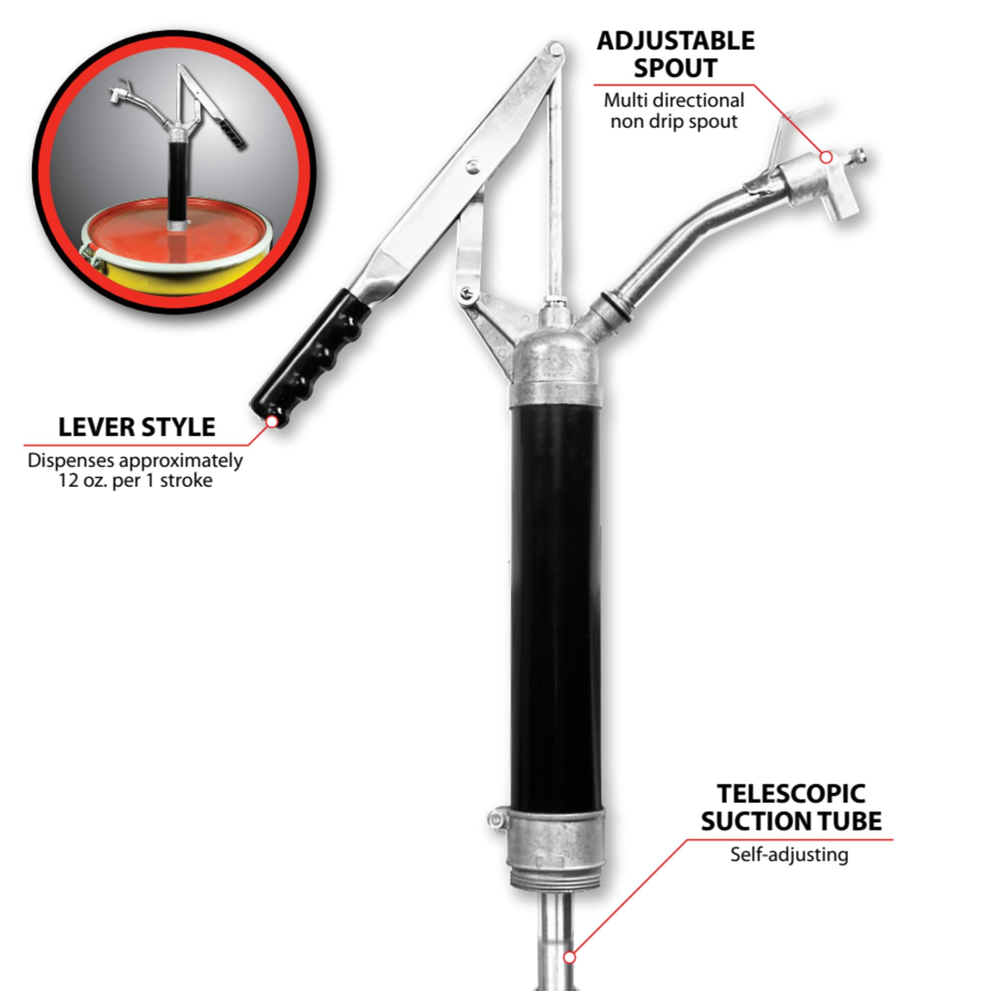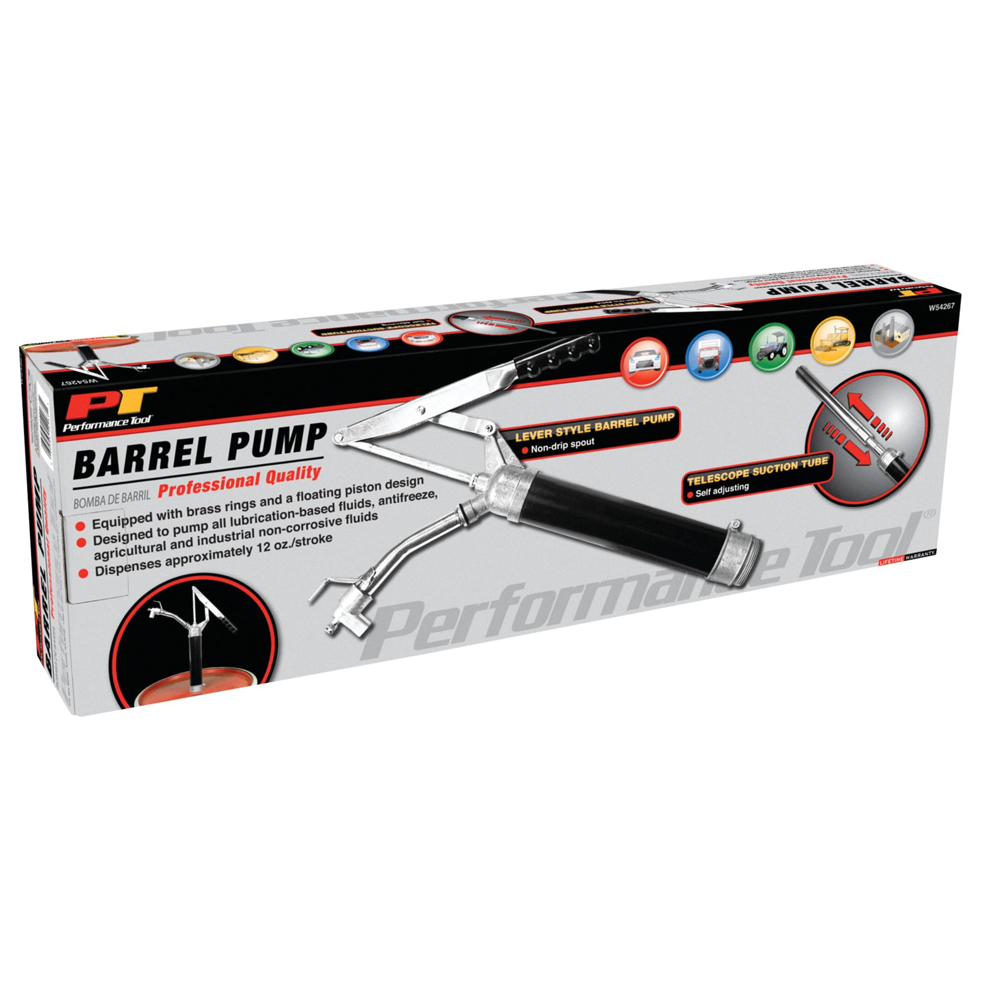 Product Description Performance Tool W54267 Professional Barrel Pump From the Manufacturer Lever style barrel pump with non-drip spout Equipped with brass rings and a floating piston design Self adjusting telescopic suction tube Designed to pump all lubrication based fluids, antifreeze, agricultural and industrial non-corrosive fluids Dispenses approximately 12-Ounce per 1stroke Multi directional handle.