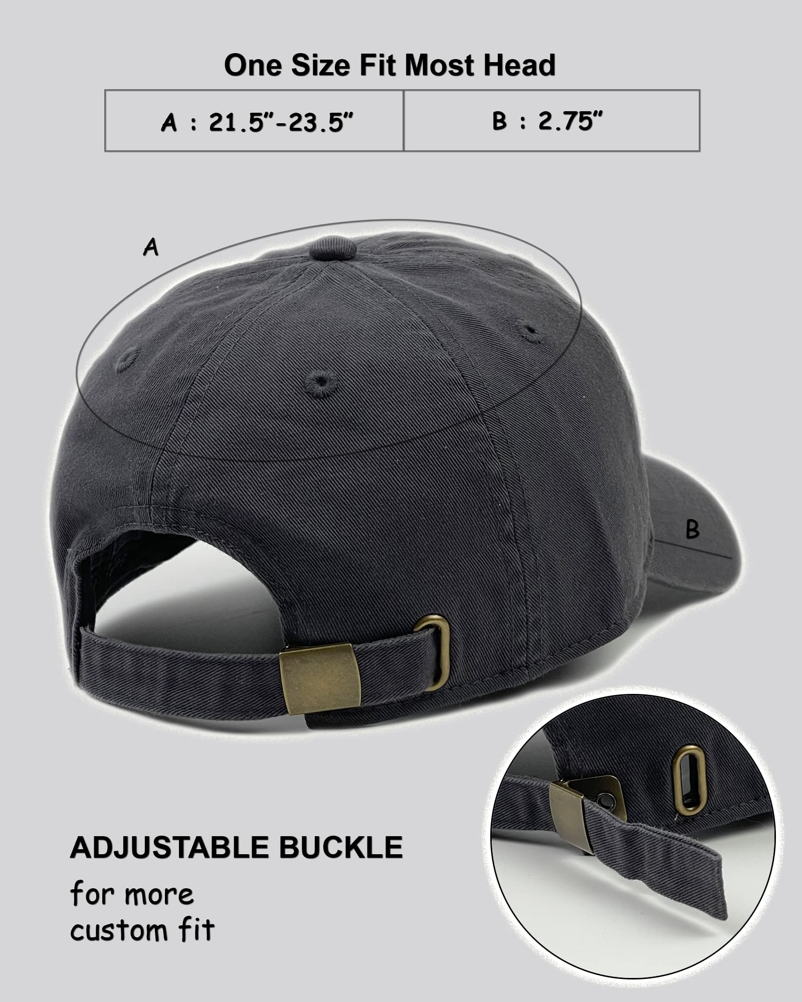 Adjustable Metal Buckle Back Closure : Great Fit for All Head Size. Hat Size Measurements : 21.5" - 23.5"