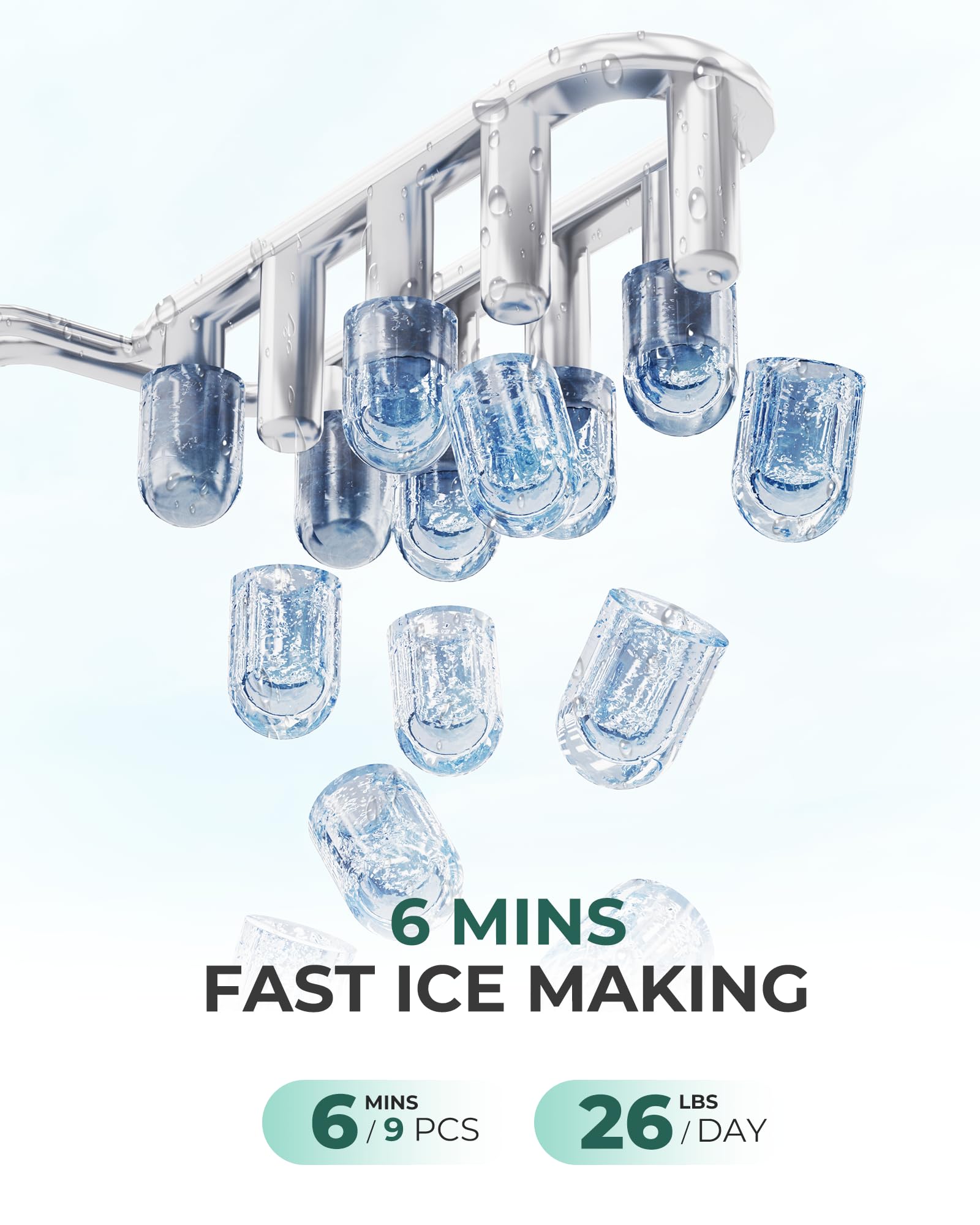 Rapid 6-Min Ice: Enjoy perfect ice in a flash with this countertop ice maker. With 6-minute cycles, get 9 bullet-shaped ice cubes at a time and produce up to 26 lbs of ice per day. Say goodbye to buying ice forever