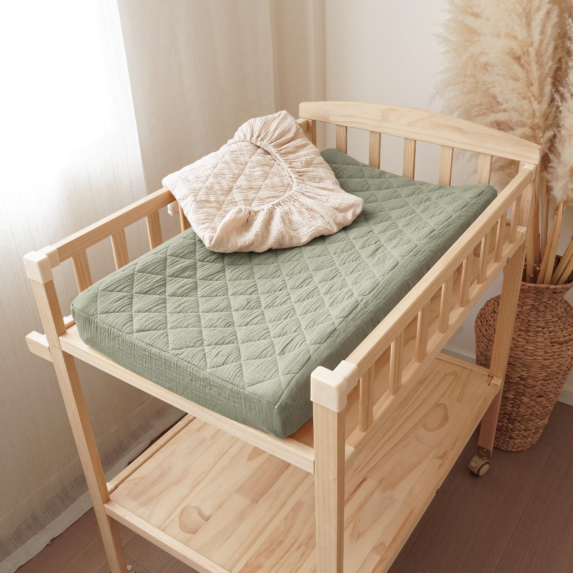 Quilted and Soft Fabric: Our changing pad cover consists of three layers: the top layer is made of 100% cotton (muslin), which is soft and absorbent; the middle layer is quilted with soft padding to ensure coziness and comfort; and the bottom layer is made of 100% waterproof polyester to protect the pad from wetting. Our unique design provides a comfortable touch for your baby while ensuring waterproof functionality, making our changing pad soft and perfect for delicate baby skin.