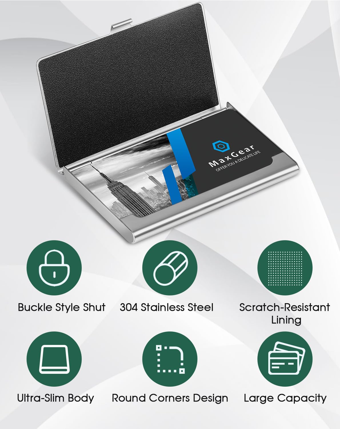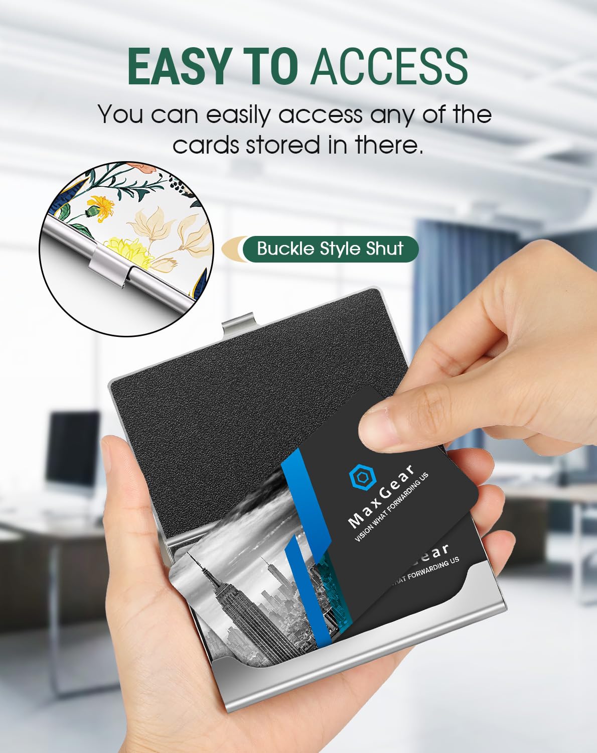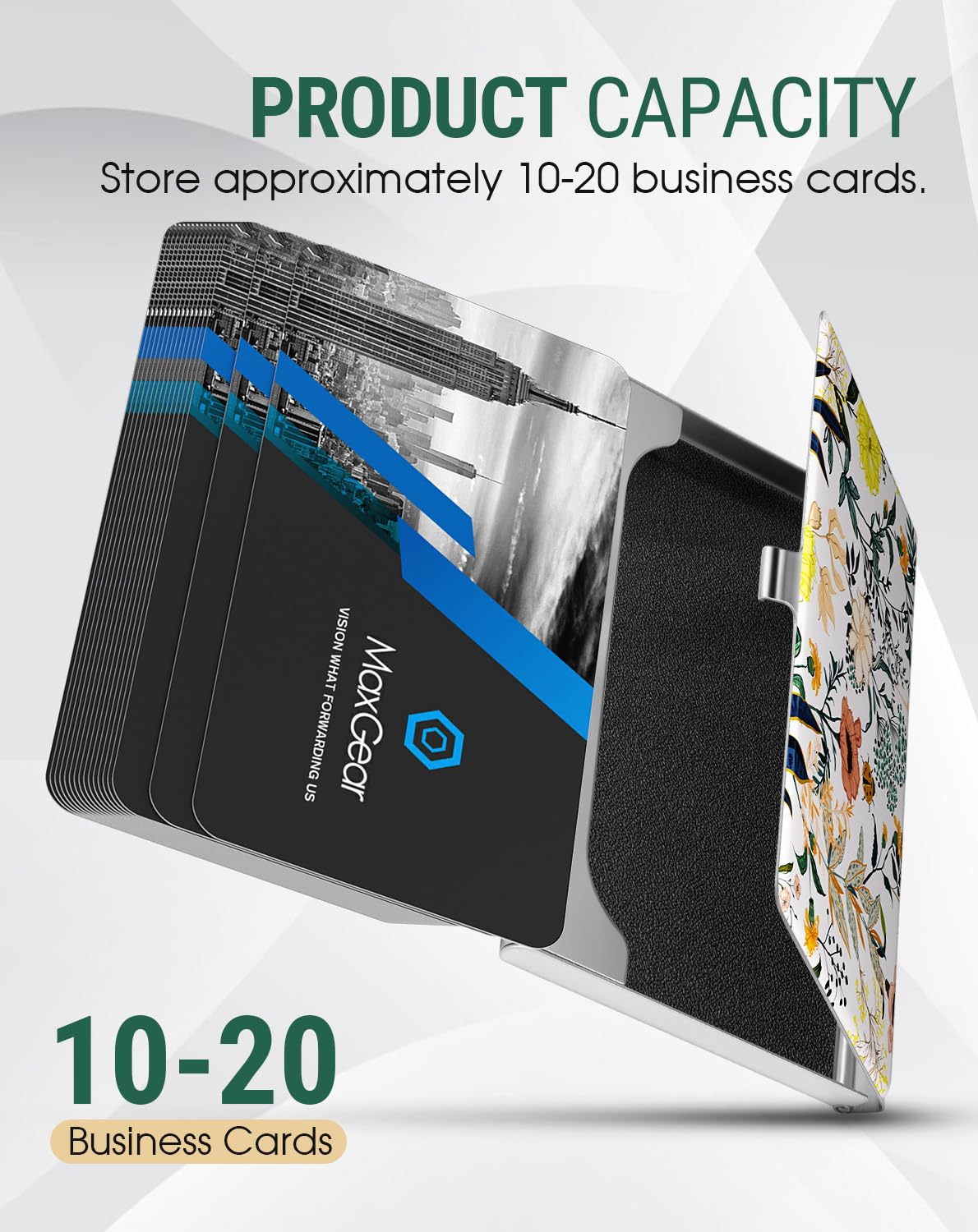 Store approximately 10-20 business cards, also suitable for ID cards, credit cards, gift cards, and more. This business card case is made of premium stainless steel. Business card box with scratch-resistant interior lining provides more protection to your cards. Size: 3.7"L x 2.3"W x 0.3"H