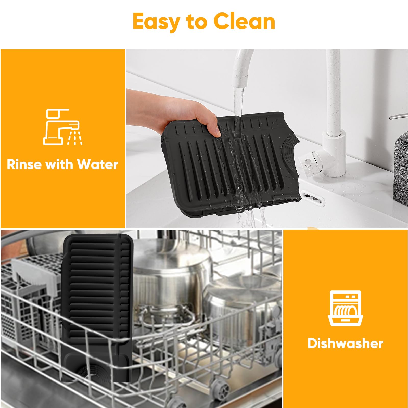 ๐ใ100% Silicone Material, Easy to CleanใGive up those wet faucet mat are made from hard-to-clean fabric that takes a lot of time to dry, our product is made from 100% silicone, will catch the water and fast self-draining to your sink. The silicone is soft and reliable, reusable and durable, won't scratch your utensils, totally safe to use. You can rinse the product with running water or dishwasher after multiple uses to fresh new the silicone sink protector, perfectly suit modern kitchen style
