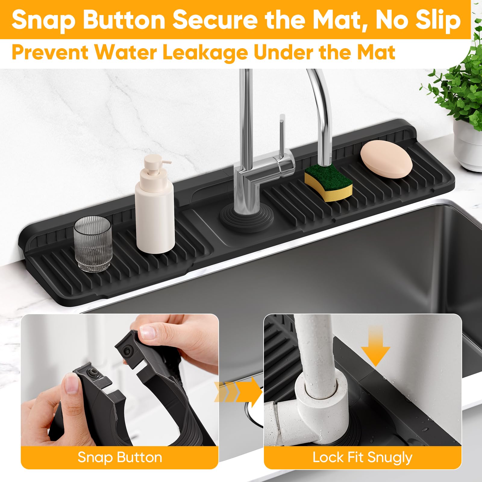 ๐ฏใSnap Button Lock, Prevent Water Gets UnderneathใInnovative fastening snap button lock design can link the product's two ends together behind faucet to hold the product firmly in place without detaching or sliding towards the sink. It can also ensures the product leaves no gaps behind the back, and good sealing to prevents water from entering. Just place our kitchen sink splash guard under the faucet and fasten the button for full countertop protection.
