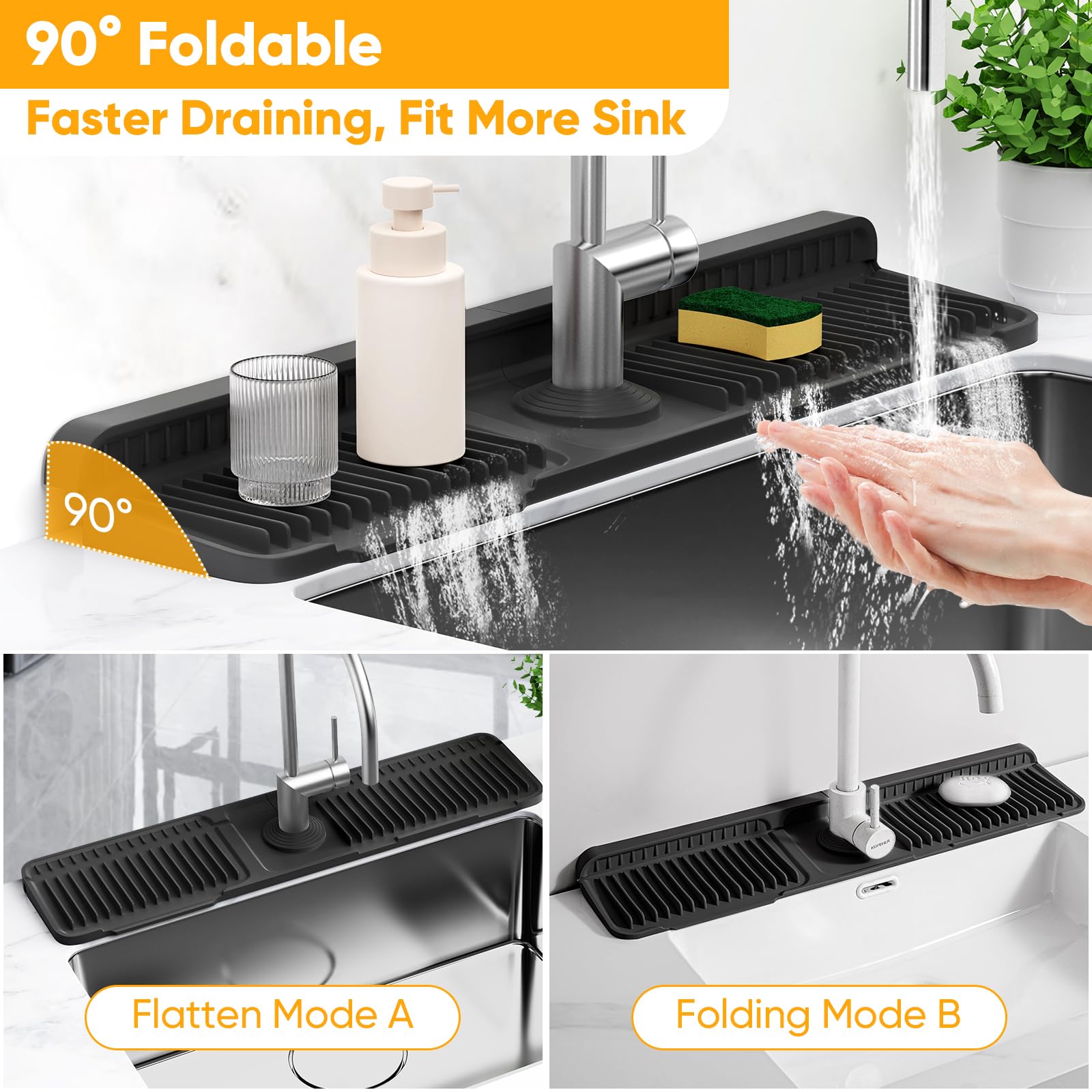 ๐ใ90ยฐ Foldable Better Draining, Fit More Sinksใ The back is flexible meaning if you don't have much space back there, You can fold the sink faucet mat splash guard by 0-1.2 inch to use and if you have more space, It can be stably laid flat on your countertops. The 90ยฐ foldable design allows easy attachment to the wall, fitting various sink countertops. This durable silicone sink splash guard keeps your sink dry and tidy while efficiently draining water for ultimate kitchen convenience.
