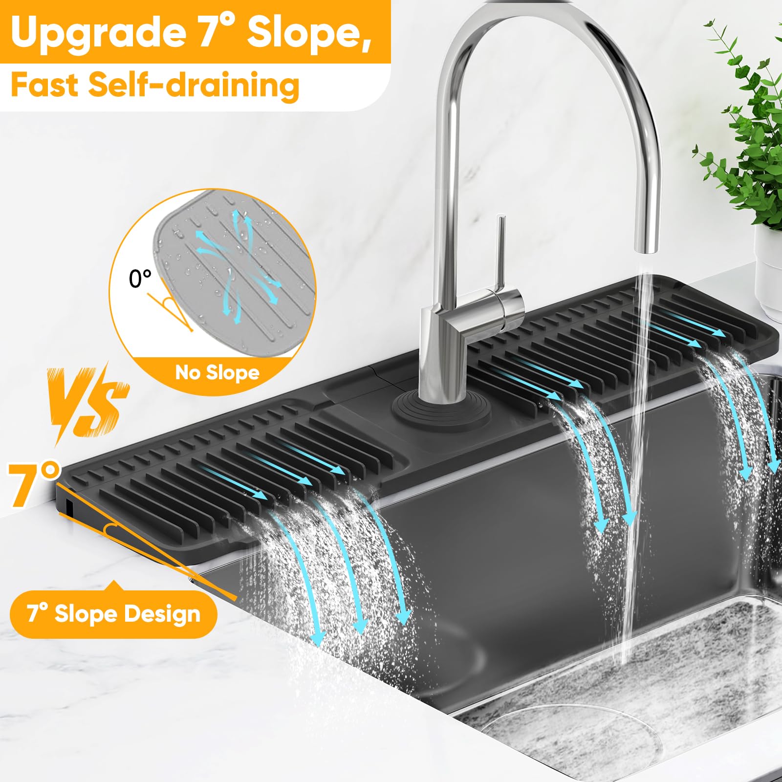 ๐ใ7ยฐ Slope Design, Fast Self-Drainingใ No more wiping the faucet base endlessly from now on. Snoquir faucet mat for kitchen sink have increased the size, thickness and weight. Latest 7ยฐ slope design allows for faster and smoother water discharge and faster drying. This means no puddles to clean up & no water spots around the faucet. The tidy splash faucet guard & draining mat behind faucet prevents water stains from the faucet splashing or leaking. Give your kitchen sink an effort-saving upgrade!