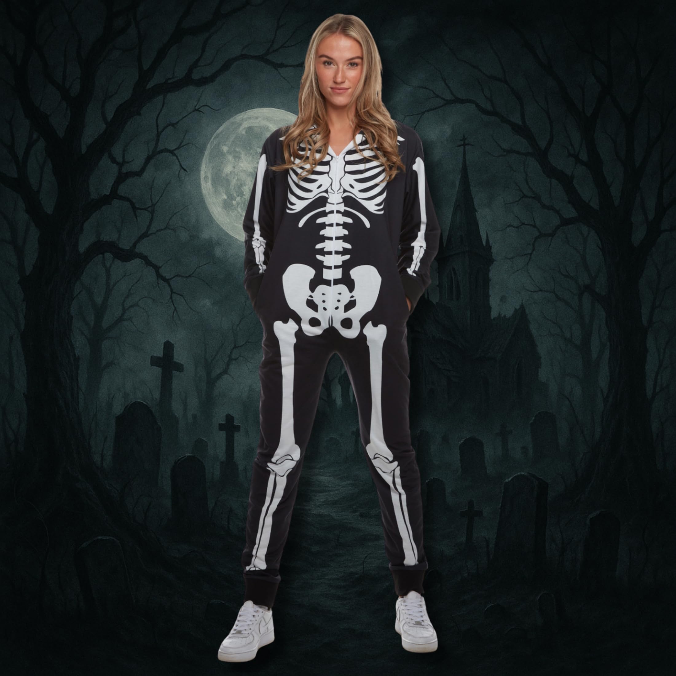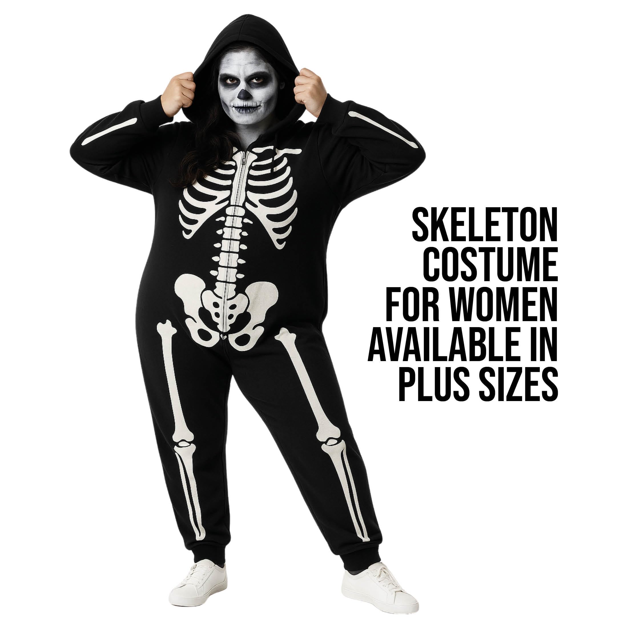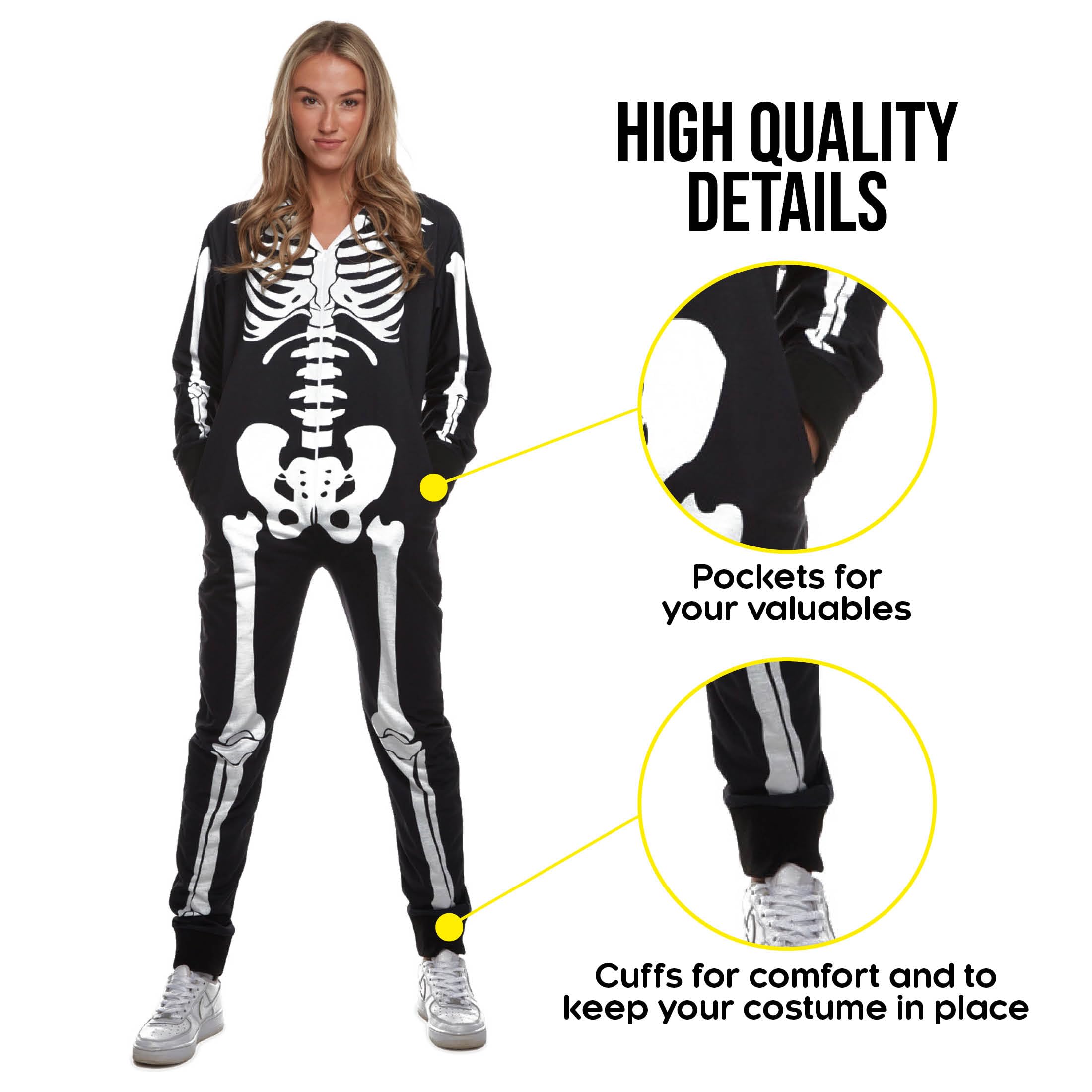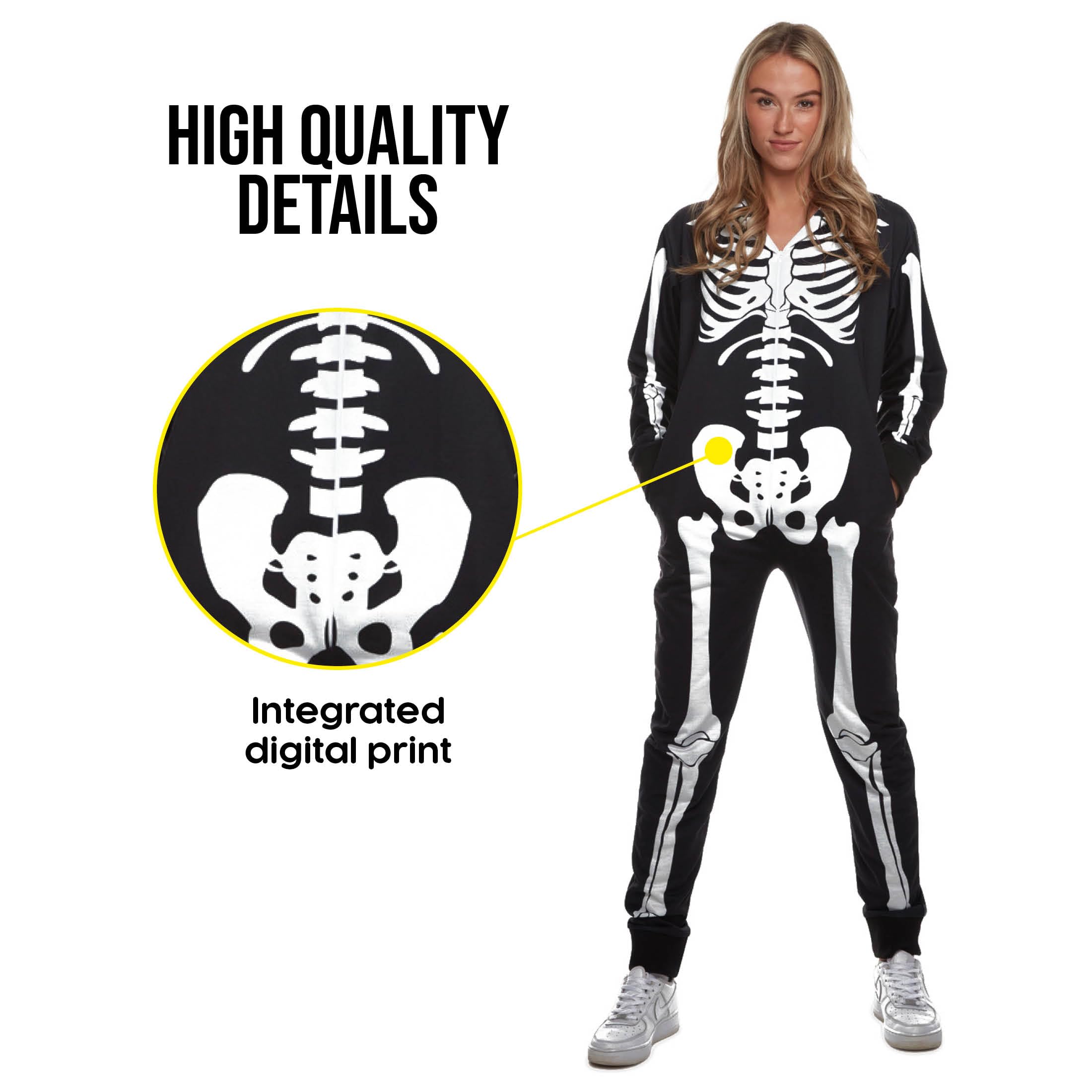Complete skeleton jumpsuit: Includes a black one-piece skeleton jumpsuit with printed bone details, cozy hood, deep pockets, and elastic cuffs for the ultimate womens skeleton costume.