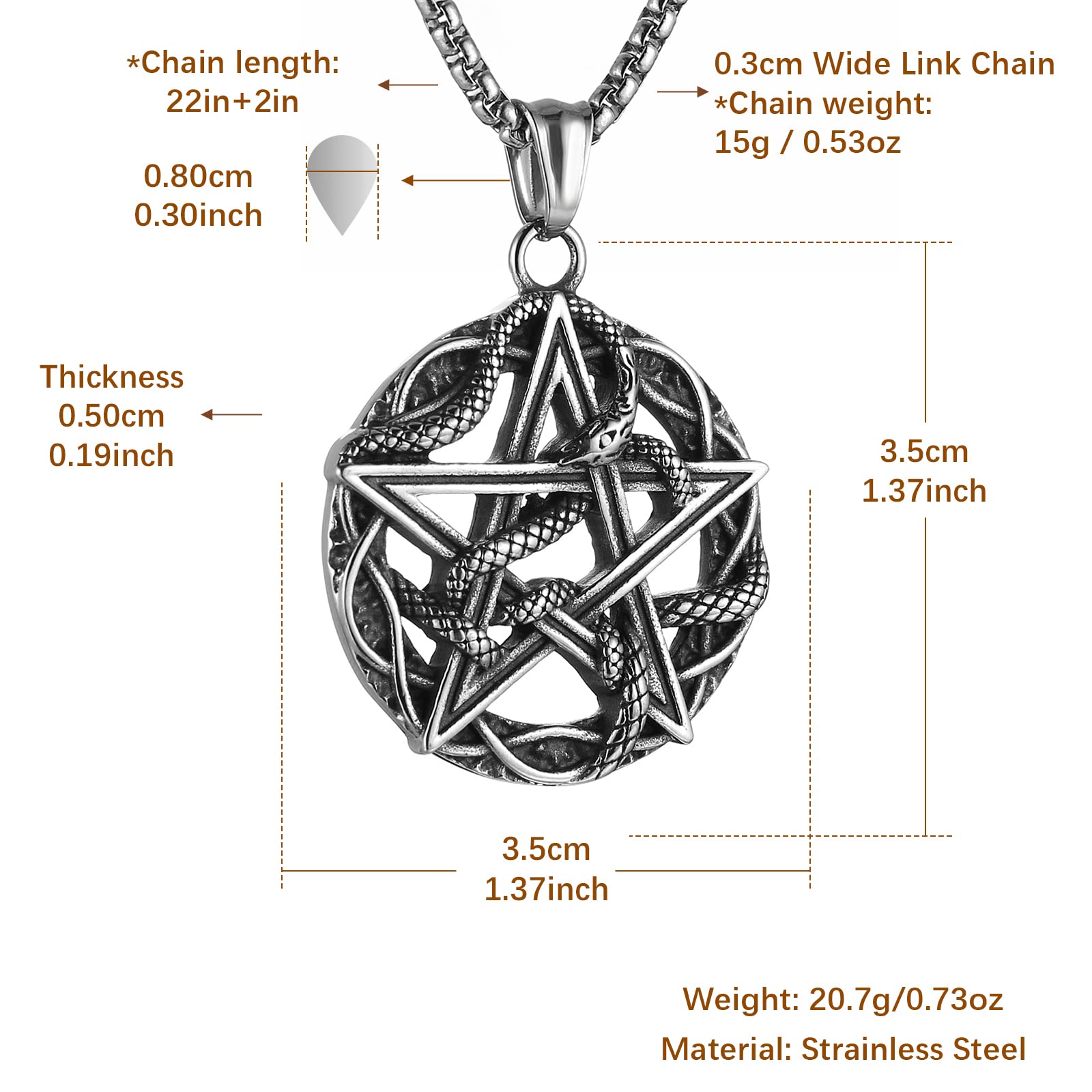 Size: The pentagram necklace measures 3.5cm x 3.5cm / 1.37in x 1.37in, weighs 20.7g and comes with a 22 + 2 inch chain