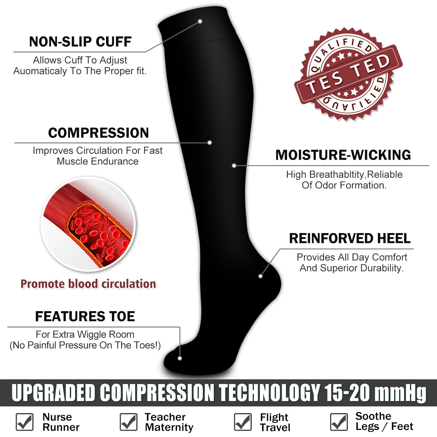 GIVE LIFE TO YOUR LEGS! - More improve circulation means more Healthier legs and less pain+swelling.Our Graduated Compression Socks put pressure in just the right spots.Provides true graduated compression to support your legs,reduce fatigue,soreness,and prevent injuries at the same time.Progressive compression technology has been recognized by many users Our copper compression socks is self-care staples.Make you feel great-no matter where,no matter when,and no matter what you're up to!