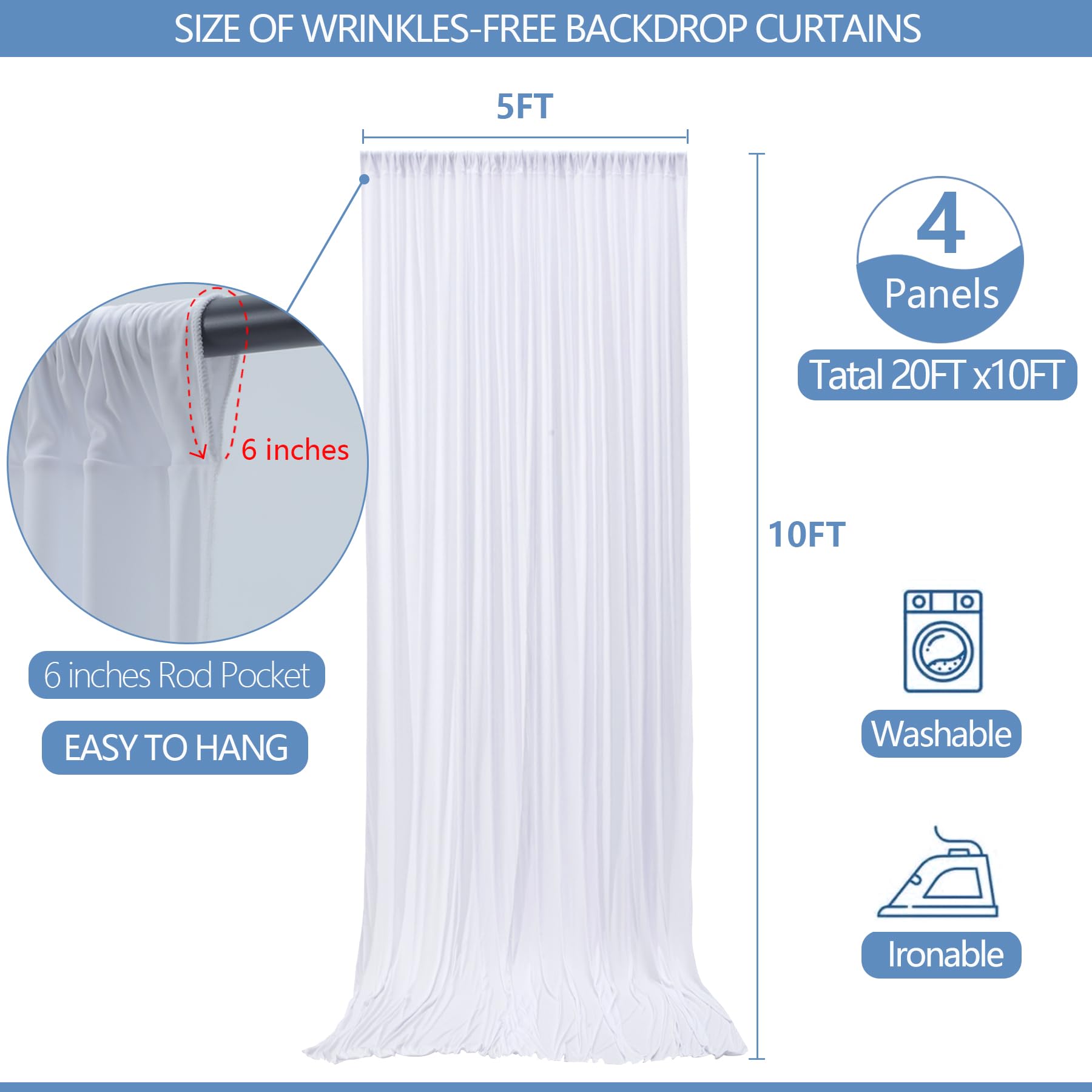 4 Panels Backdrop Curtains Package —— Your package includes 4 panels of soft white backdrop curtains, each measuring 5FT in width and 10FT in height. Together, they create a perfect 20FT x 10FT backdrop, providing ample room for various occasions. Please note: Not including the background stand