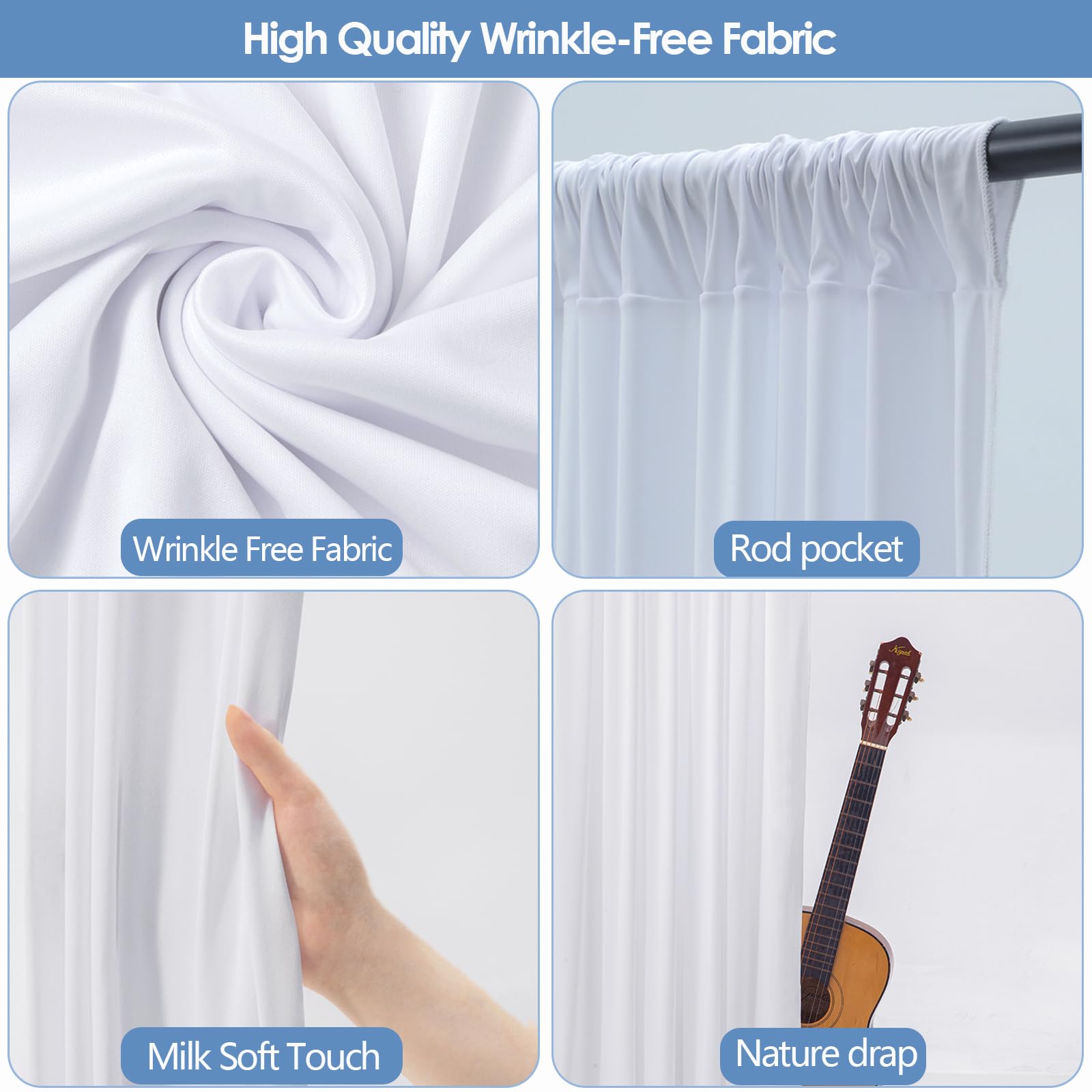 High-Quality Wrinkle-Free Fabric —— Crafted from premium 100% high-quality polyester fabric, this white wedding backdrop offers a silky smooth texture, and an irresistibly soft touch akin to milk. The backdrop Curtains for wedding droops naturally and the texture is very good, will make your wedding more elegant