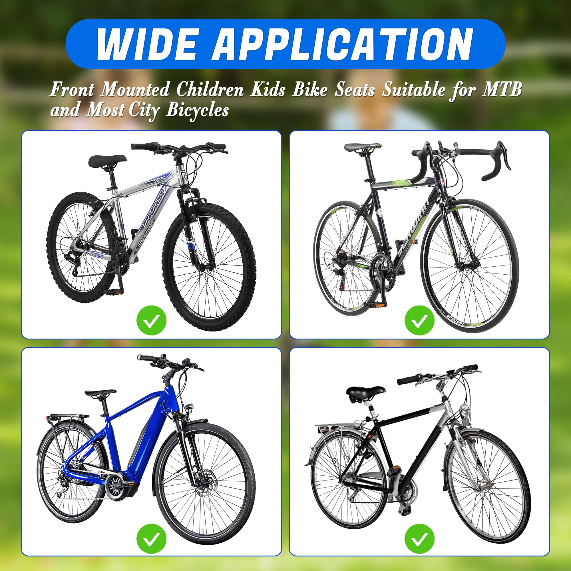 COMPATIBLE WITH ALL MTB - Kids bike seat fits all adult mountain bikes with flat or little sloping top tubes. The kids bike handlebars fit flat or riser style handlebars. Share your passion for mountain biking, with your child riding, you'll foster a love of mountain biking and the outdoors. Front mounted child bike seat designed for children 2-5 and up to 120lbs.