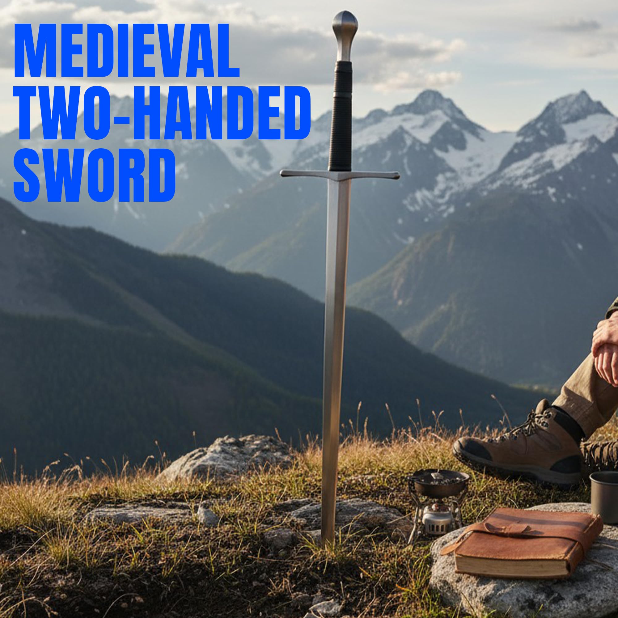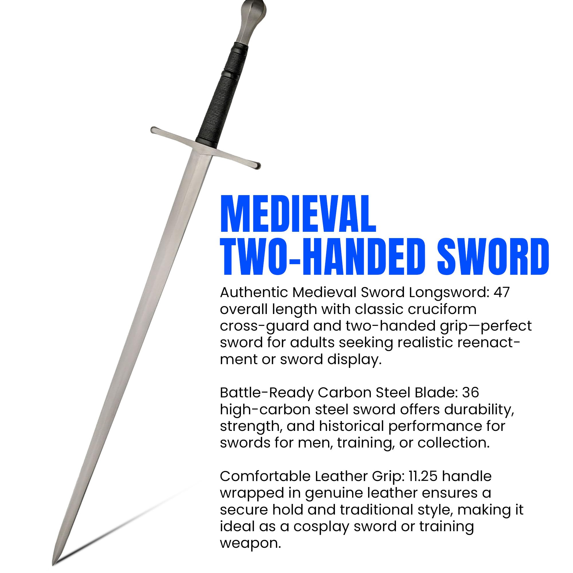 Unleash the might and majesty of medieval warfare with our 47-inch two-handed medieval sword—a stunning blend of craftsmanship, strength, and realism. Featuring a full 36-inch carbon steel sword blade, this weapon includes a traditional cruciform cross-guard and a firm leather-wrapped grip, offering both authenticity and control. Whether you're interested in swords for adults or swords for men, this piece delivers. Paired with a custom leather scabbard, this battle-ready sword with sheath is as practical for storage as it is glorious for sword display. Perfect for historical reenactments, martial training, or fantasy roleplay, it also functions as a striking cosplay sword. Each SZCO sword is handmade and battle-tested to stand up to the demands of LARP, medieval events, and collectors alike. Whether you're a film prop master, enthusiast, or simply want a standout piece for your collection, this real sword for adults will impress. Add this timeless weapon to your armory and wield your legacy with pride.