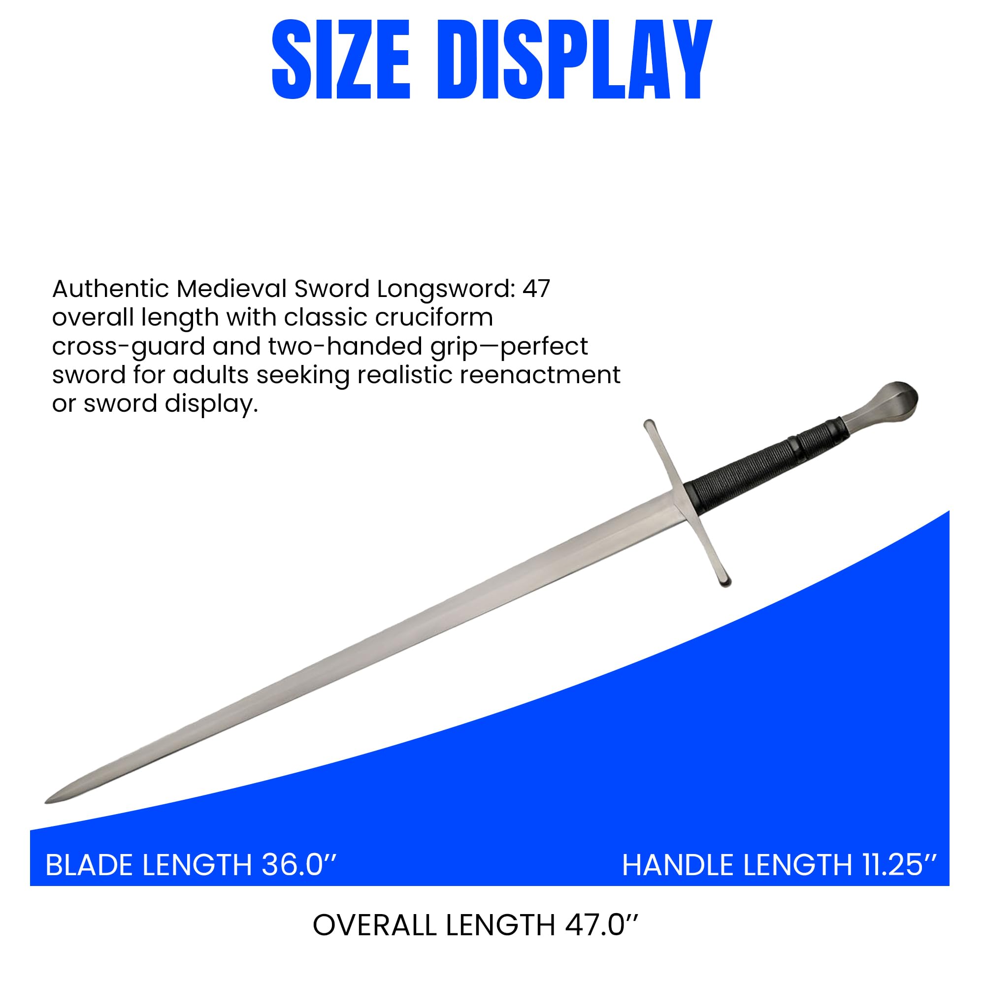Authentic Medieval Sword Longsword: 47″ overall length with classic cruciform cross-guard and two-handed grip—perfect sword for adults seeking realistic reenactment or sword display.