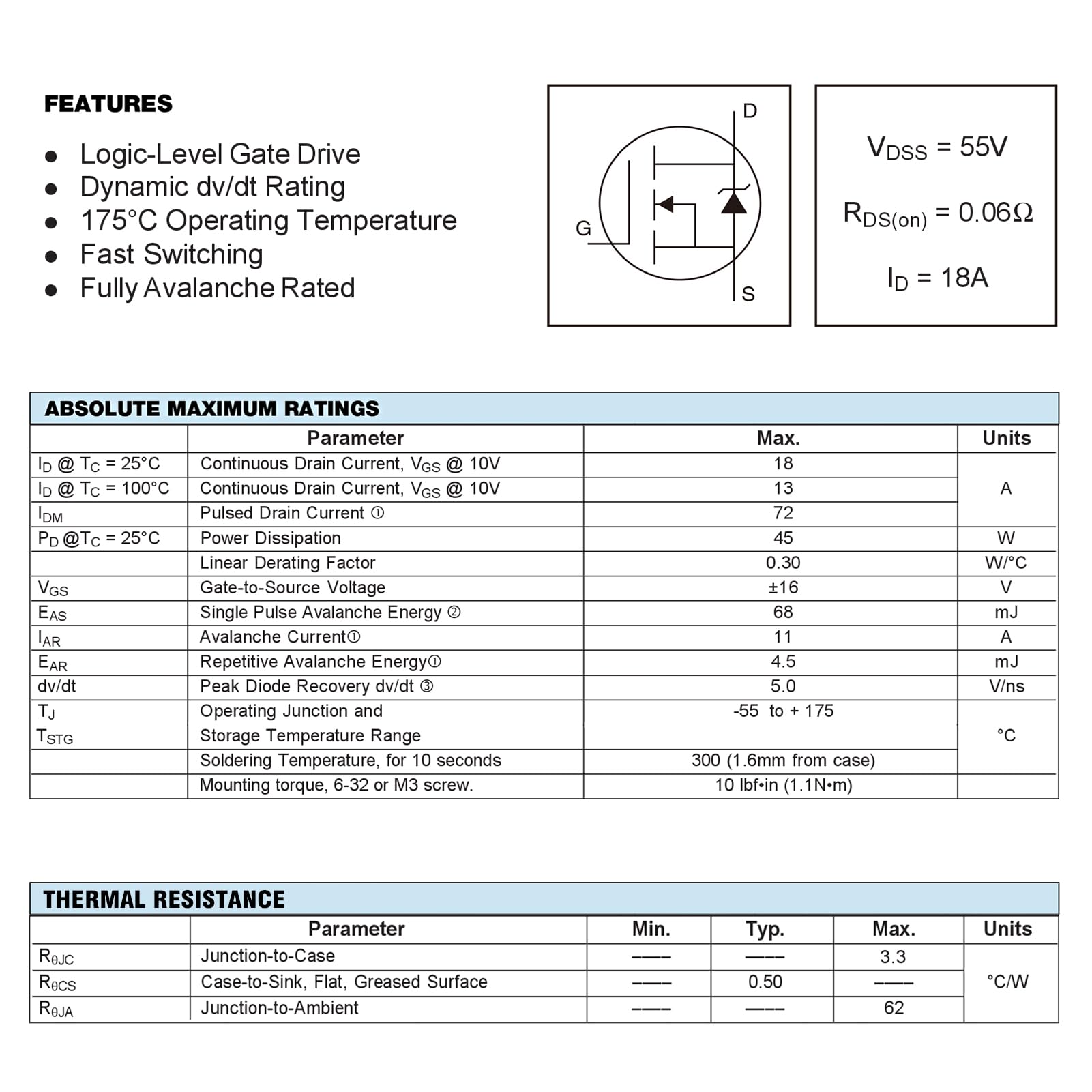 Features & Advantages: Advanced process technology & Fast switching & Dynamic dv/dt rating & Fully avalanche rated.