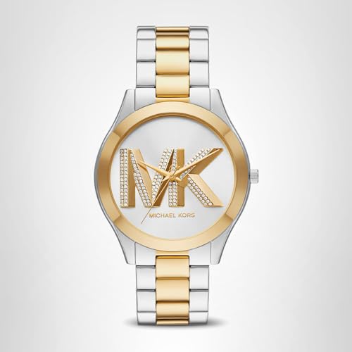 Michael Kors' 42mm Slim Runway watch features a gold and silver pavé sunray dial, three-hand movement and two-tone stainless steel bracelet.