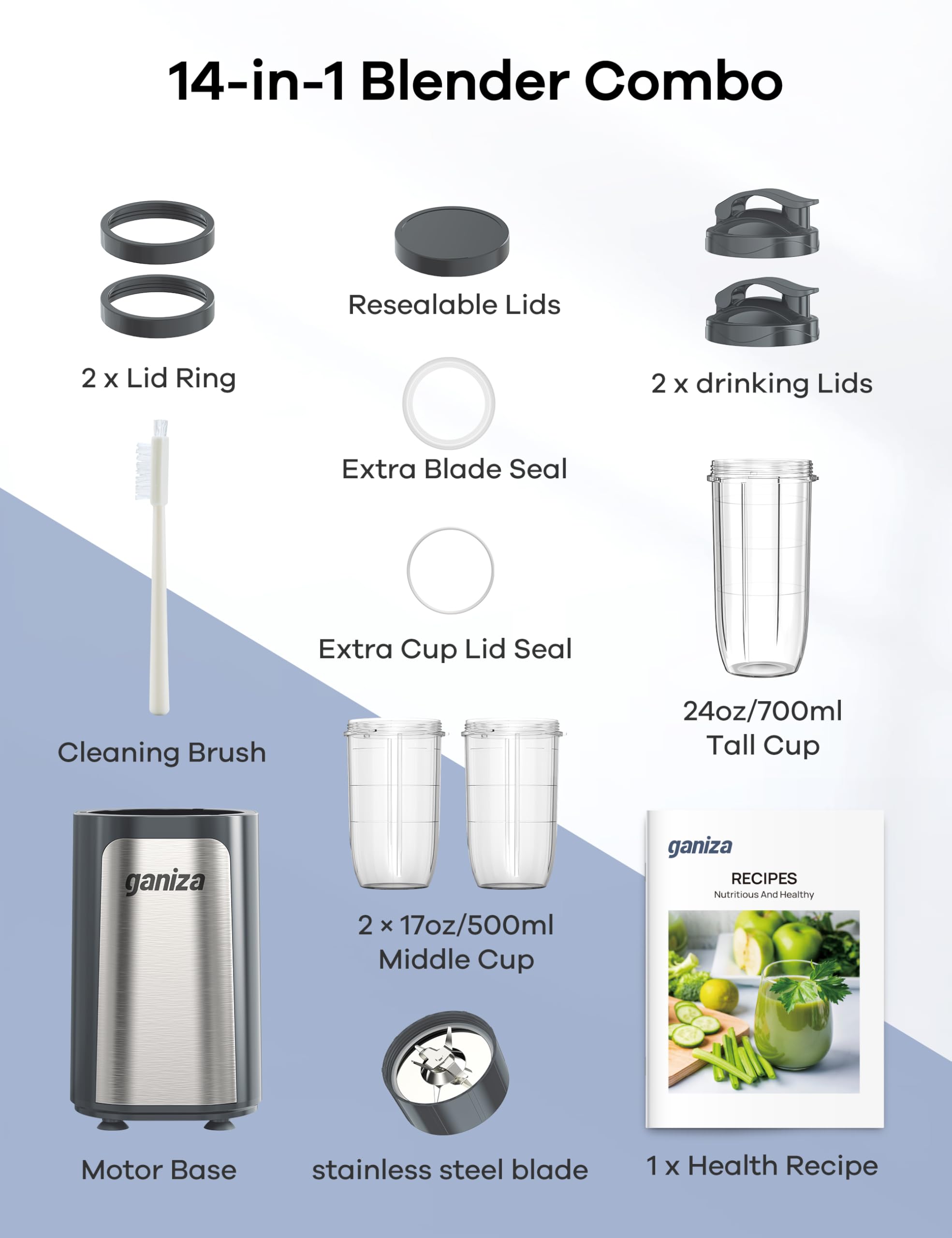 14-in-1 BLENDER COMBO: INCLUDE (1) Peak Power 900W motor base, (1) Cross-blade , (1) 24 oz. portable Cup, (2) 17 oz. Middle Cup, (2) to-go lid, (2) lip ring, (1) resealable Lids, (1) Cup Sealing Ring, (1) Blade Sealing Ring, (1) Small brush, (1) Recipe.