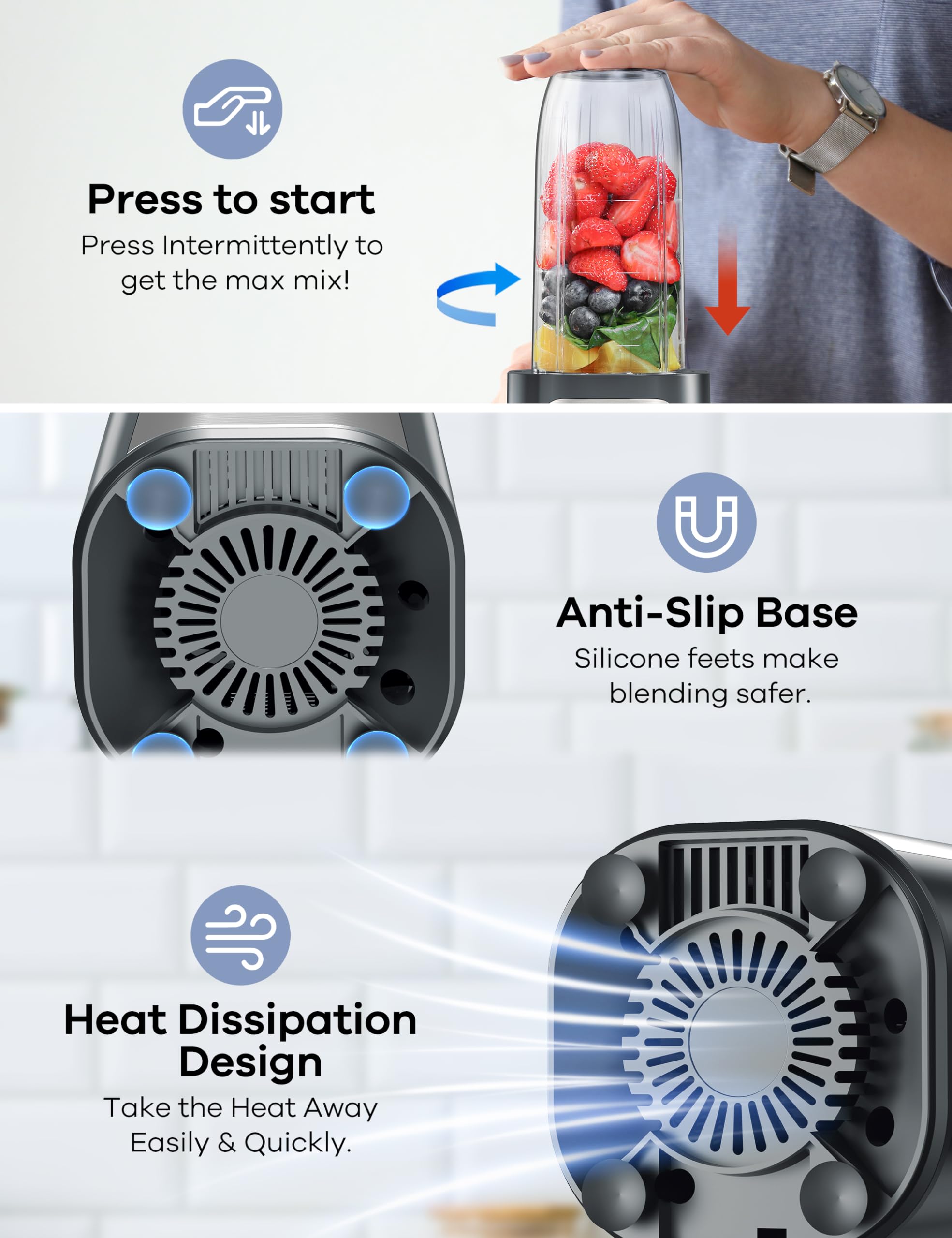 GREAT BLENDING: This Countertop blender for kitchen comes with Food Grade 304 stainless steel blades for all purposes blending, that can make smoothies, shakes, juices, frozen drinks in seconds.