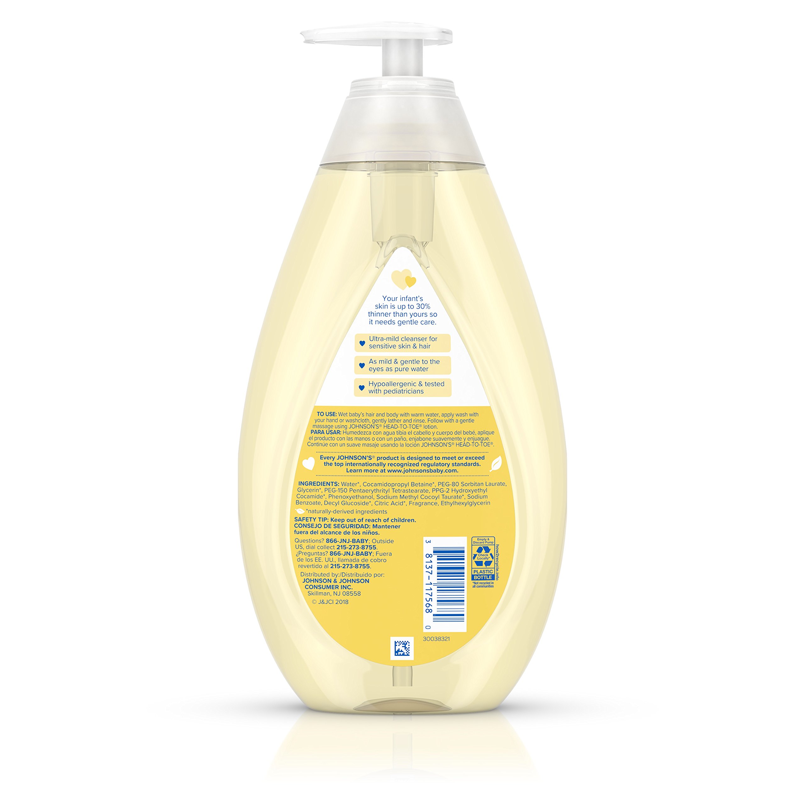 Gentle enough for newborns, Johnson’s Baby Head-To-Toe Wash & Shampoo is a tear-free, 2-in-1 baby wash and shampoo that safely and gently cleanses your baby’s delicate skin and hair. Made with aloe vera and vitamin B5, this non-drying baby wash is clinically proven safe for newborns. It helps protect skin from dryness, leaves your baby's skin feeling soft and hydrated, and is made with Johnson's baby unique gentle scent. This hypoallergenic, pH-balanced baby shampoo and body wash is pediatrician tested and has no added parabens, sulfates, and dyes. The No More Tears® formula is as gentle to the eyes as pure water, making bath time stress-free. Part of the perfect 3-step bath routine: 1. Shampoo with Johnson's Baby Shampoo 2. Wash with Johnson’s Baby Head-To-Toe Wash & Shampoo 3. Moisturize with Johnson’s Baby Lotion Packaged in a bottle made with 50% recycled plastic. Our Formula: Formula, now with Aloe & Vitamin B5: Leaves hair feeling soft and skin feeling soft and hydrated No added parabens, sulfates, & dyes. Tested with Pediatricians; Made with unique gentle baby scents How to Use: Apply with warm water using your hand or a washcloth, gently lather, rinse, & follow with a massage using Johnson's Baby Lotion. Our Brand Story: Johnson’s Baby cares for what is precious: your baby’s precious skin and hair, and precious moments of bonding. For over 125 years, we’ve been committed to crafting gentle, science-backed baby care prod-ucts that support happy, healthy bonding moments. World's #1 Baby & Child Care Brand* *Source Euromonitor International Limited; Beauty and Personal Care 2025 ed. As per Baby and Child-Specific Products Category; all retail channels; value sales at RSP; 2024 data.