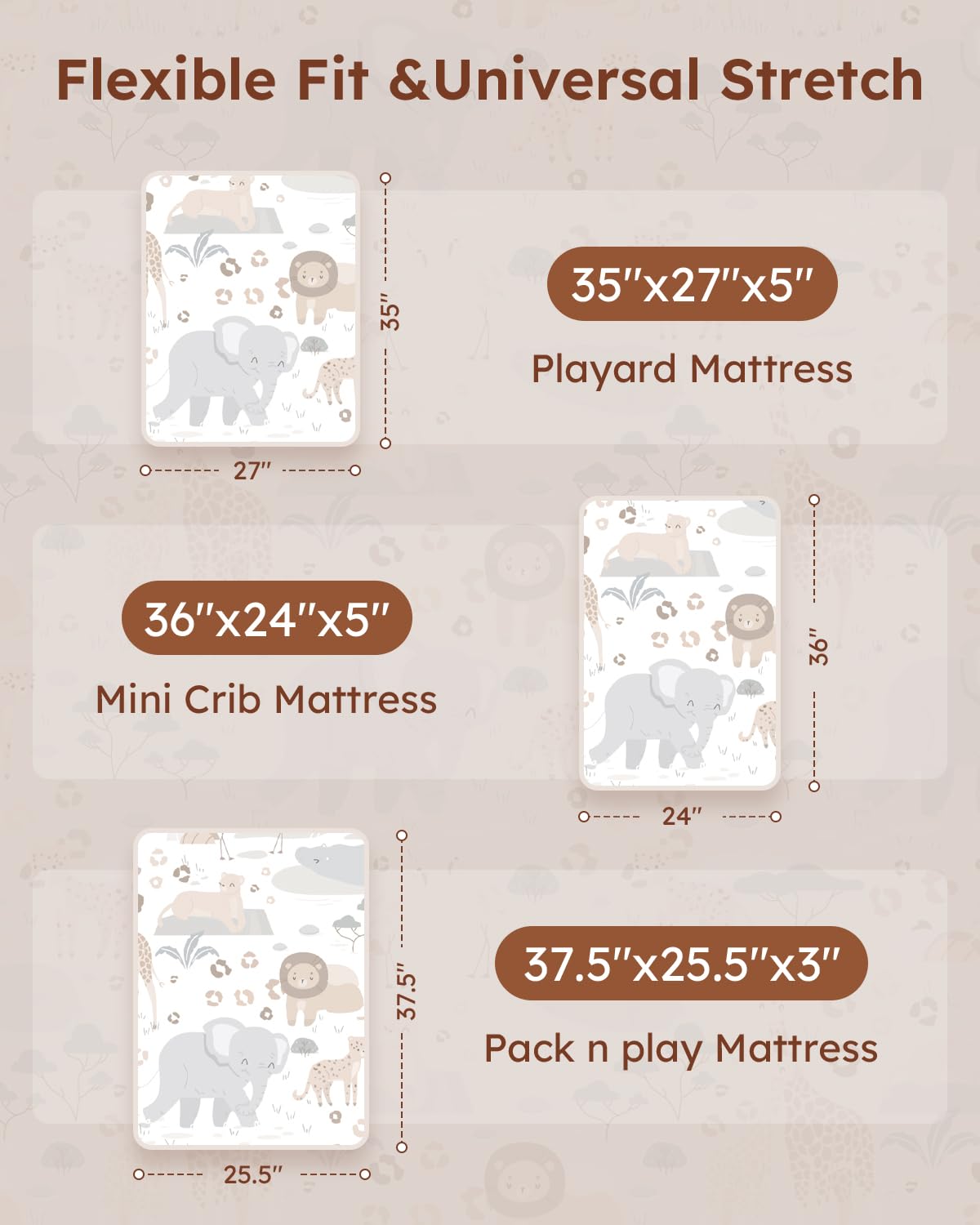 Measured 38''X 26'', our pack and play sheets securely fit pack n play crib mattress, mini crib and playard mattresses. 5-inch deep pocket offers safe and reliable 360° coverage, providing ultimate protection for your exquisite mattress.