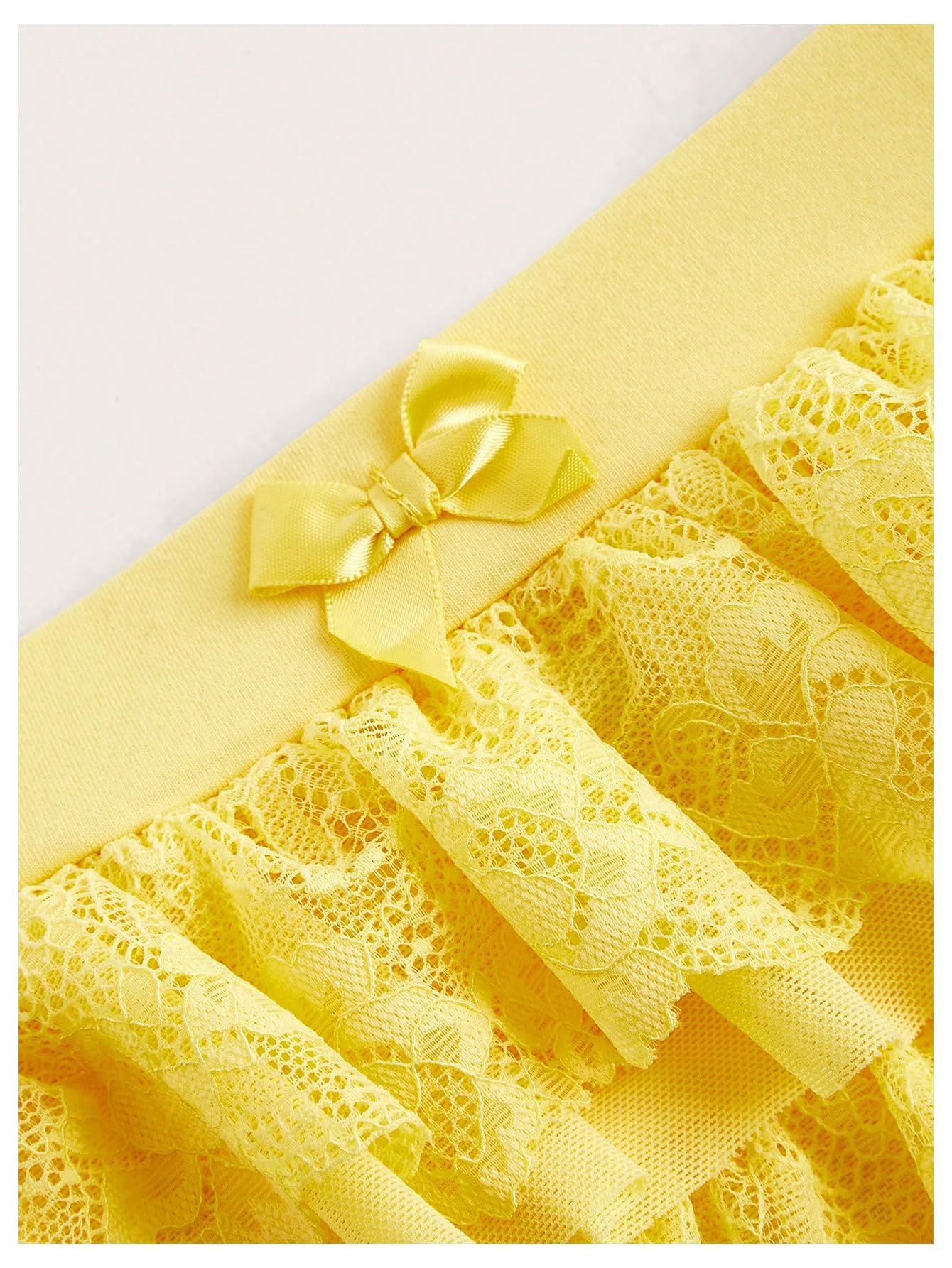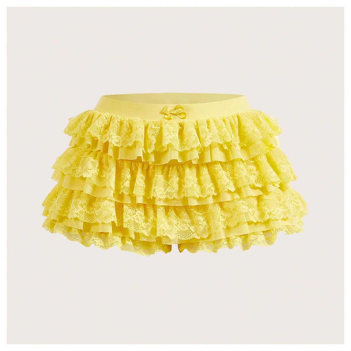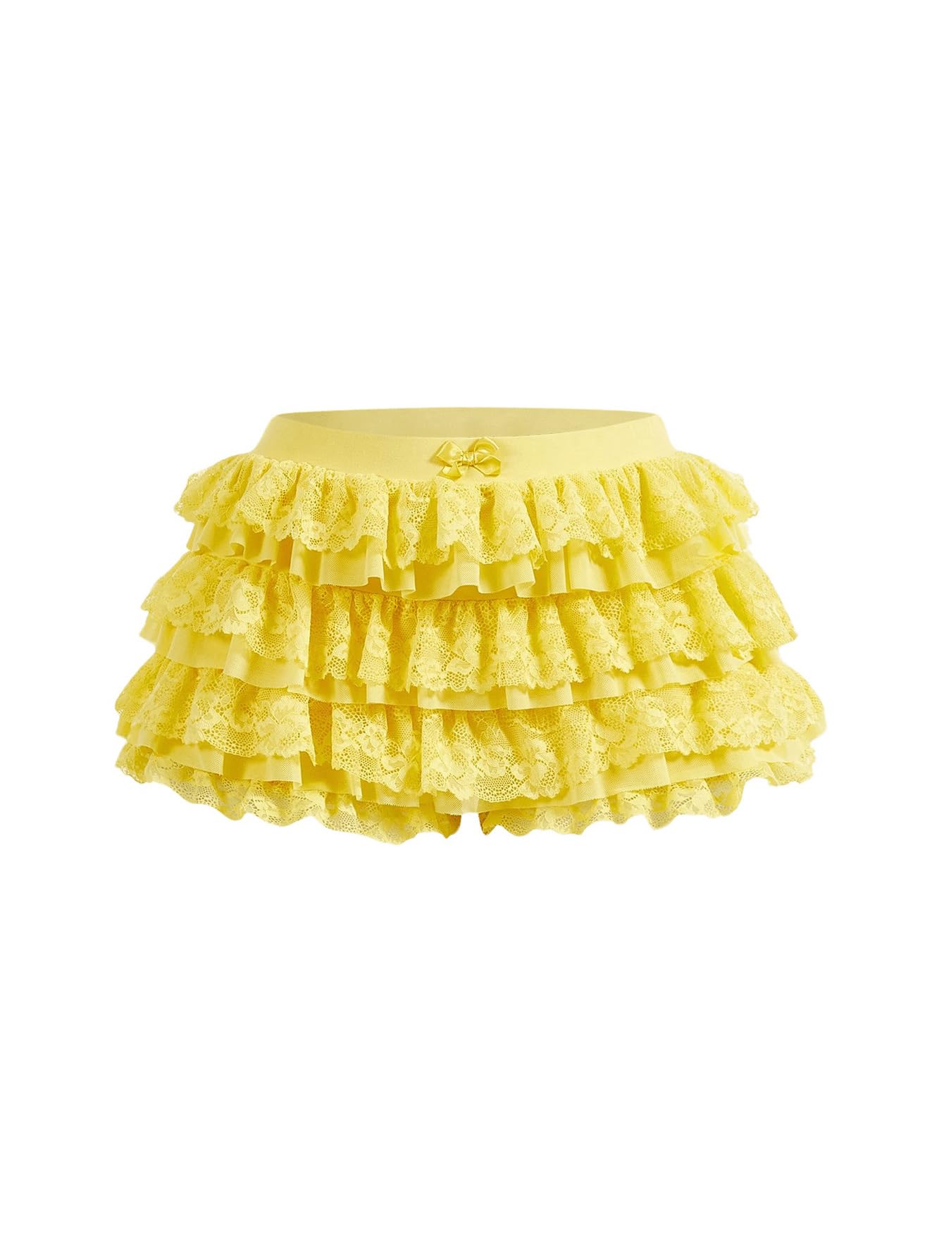 Features: This lace short pants are designed with layered ruffle lace trim, small bow front, elastic waist, low waist and solid color. The shorts have a cute, sweet and fashion style for women.