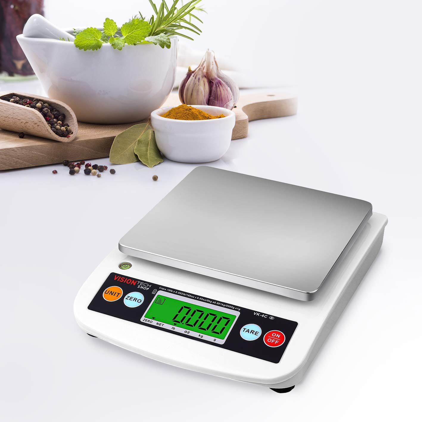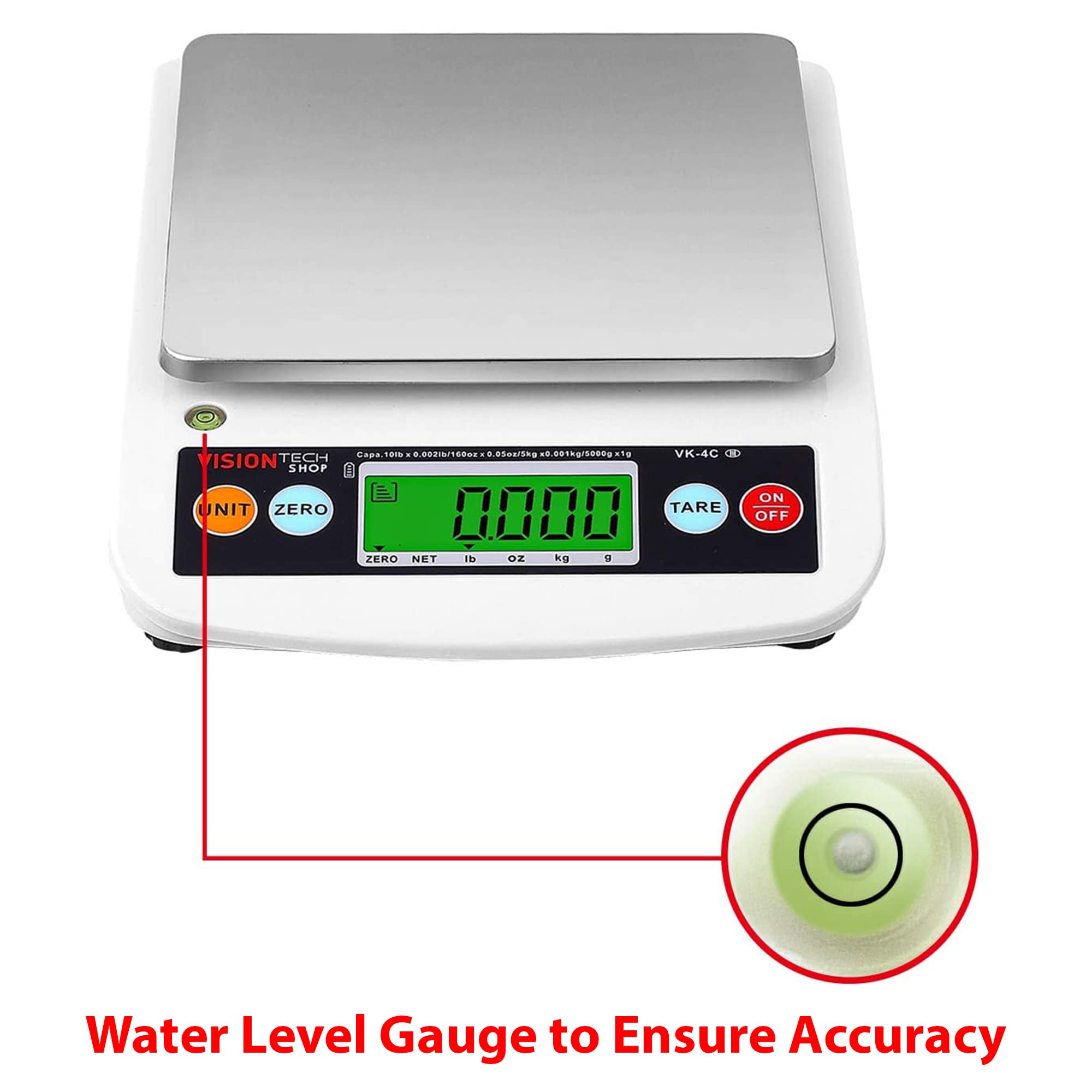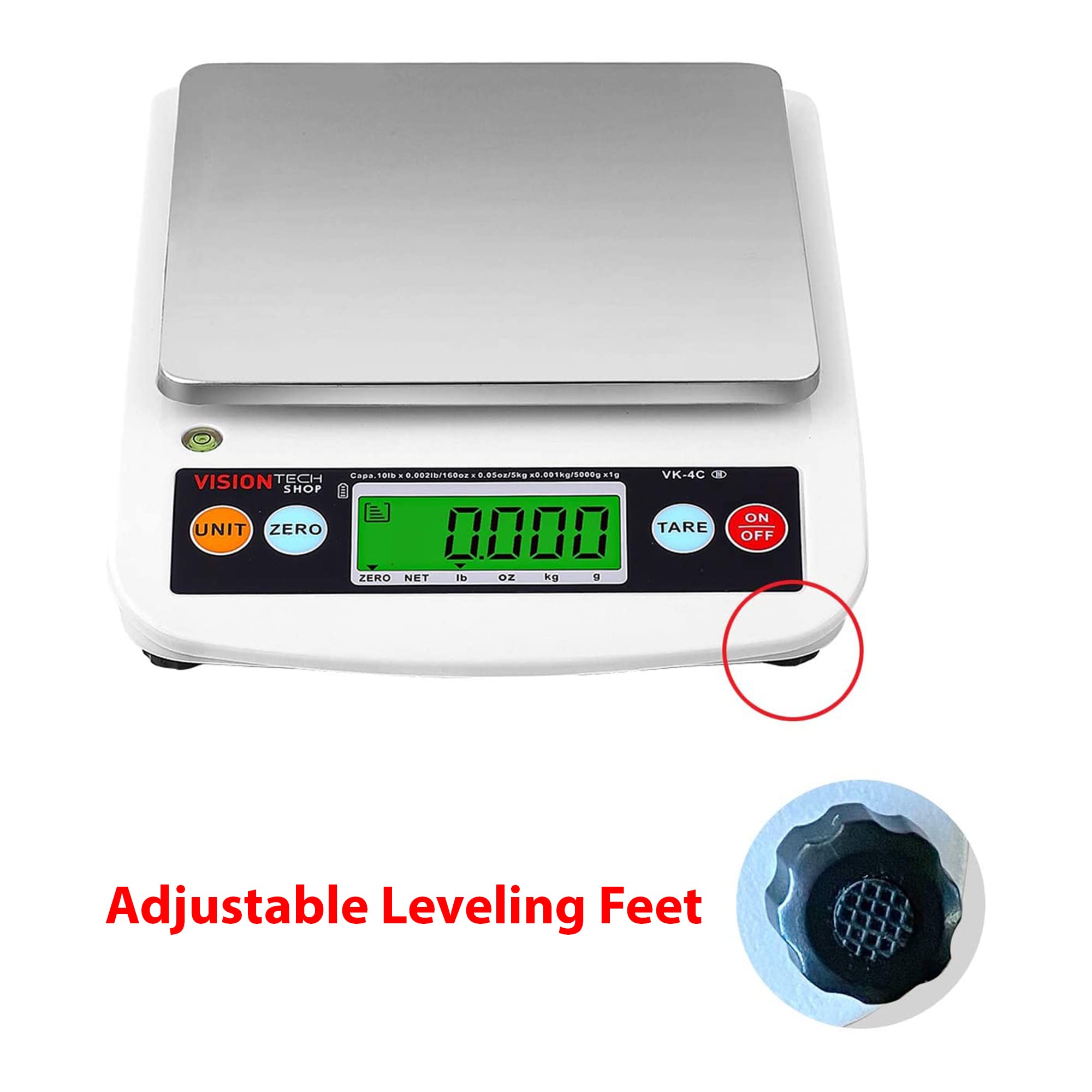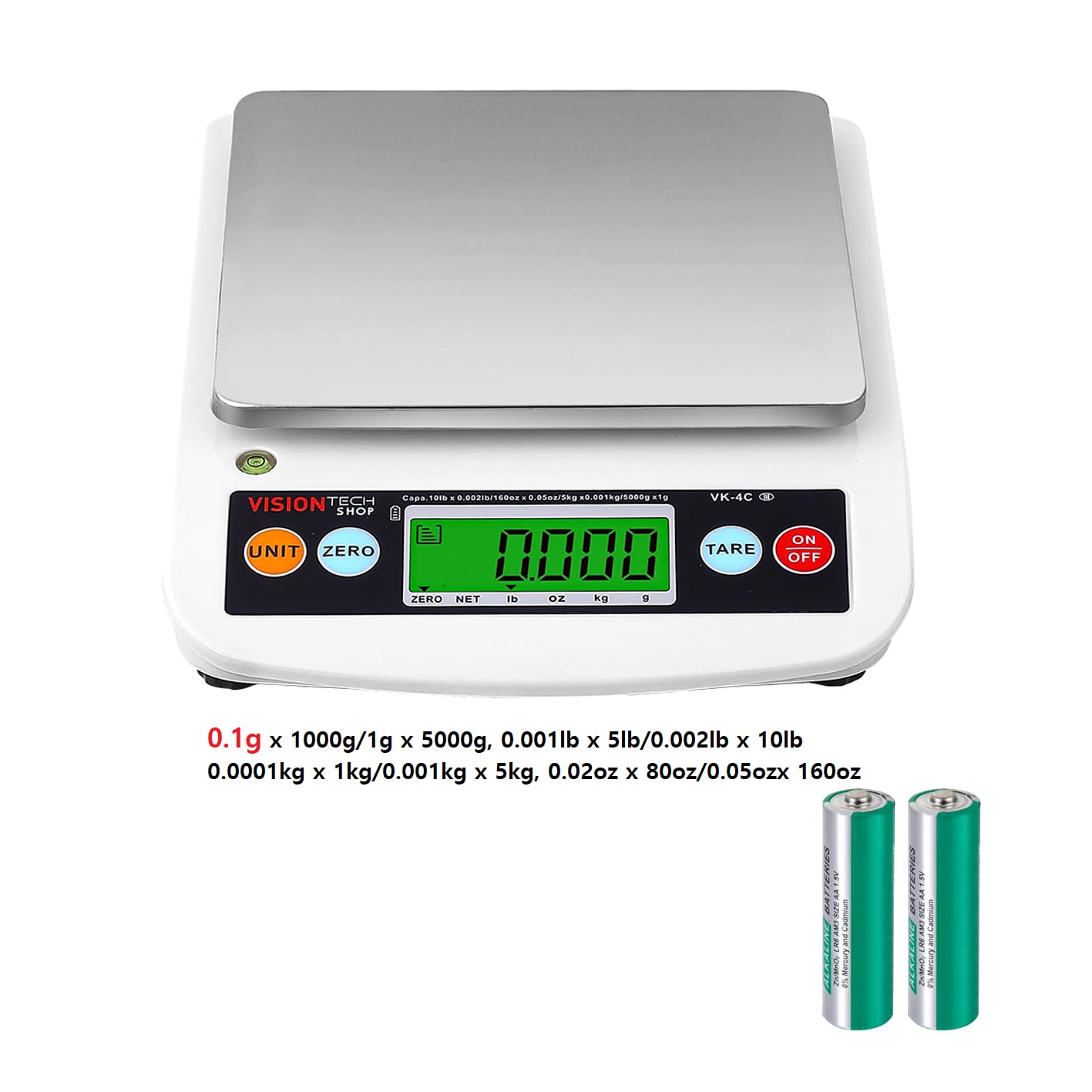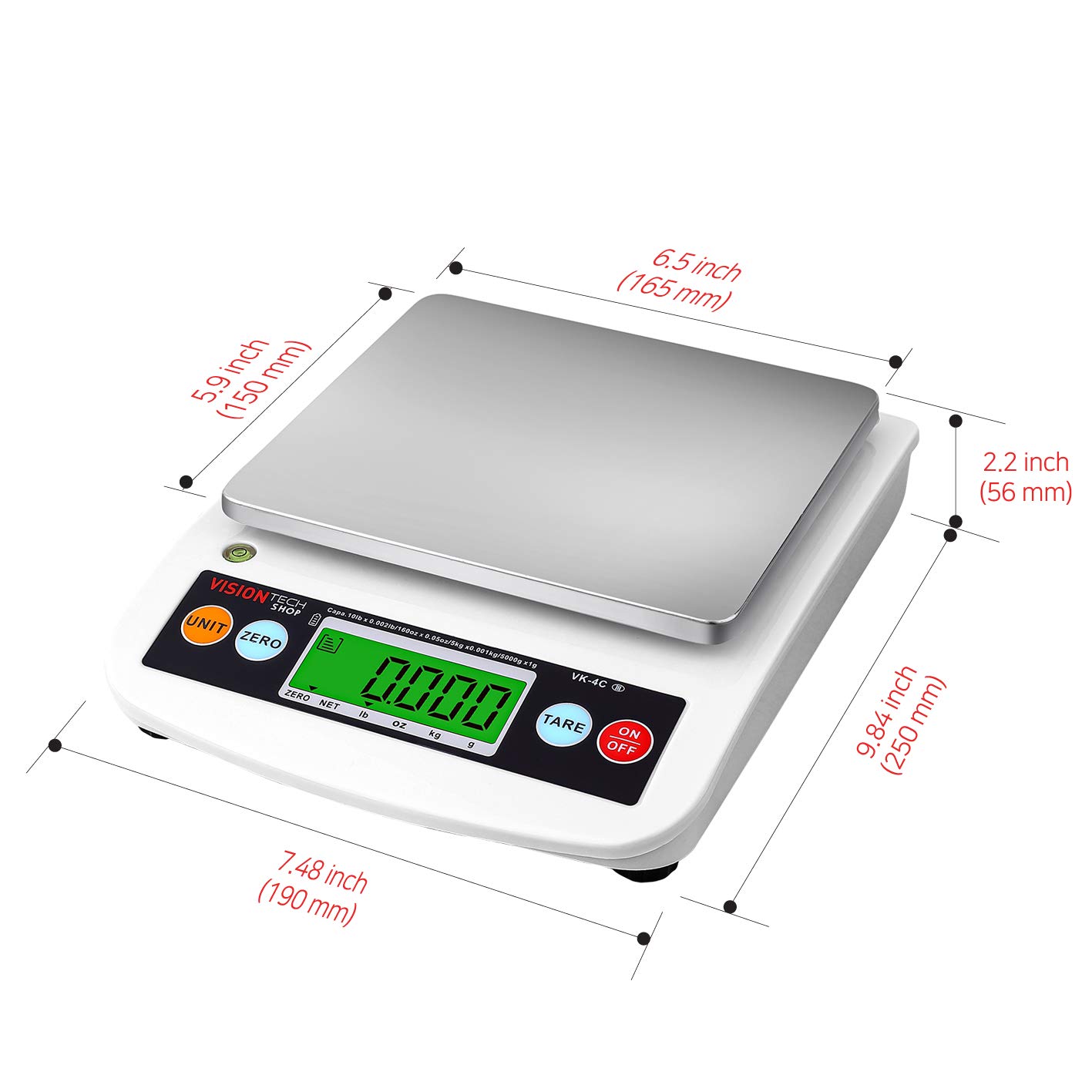 Capacity 5lb x 0.001lb/10lb x 0.002lb, 80oz x 0.02oz/160oz x 0.05oz, 1kg x 0.0001kg/5kg x 0.001kg, 1000g x 0.1g/5000g x 1g, Size: 7.48 x 9.84 x 2.2inch / 190 x 250 x 56mm(W x D x H), Net Weight: 1.5lb/680g