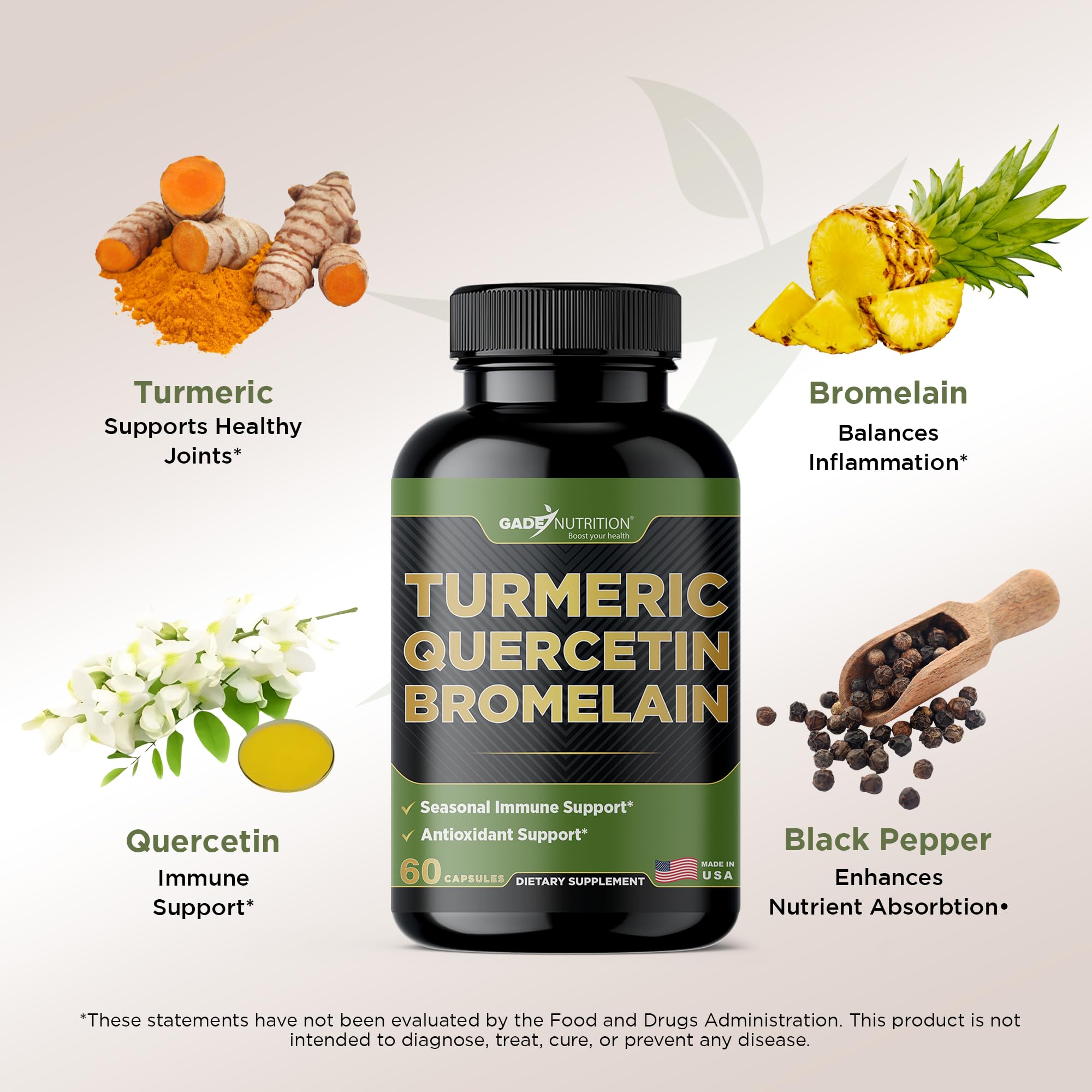 Premium Turmeric Supplement With Quercetin and Bromelain: This supplement combines the benefits of turmeric curcumin, quercetin, and bromelain in a high-absorption formula. Turmeric powder, a well-known ingredient, contains curcumin, a natural compound with powerful properties. Black pepper extract is included to ensure optimal absorption and effectiveness. The addition of quercetin with bromelain creates a synergistic blend designed for comprehensive support.