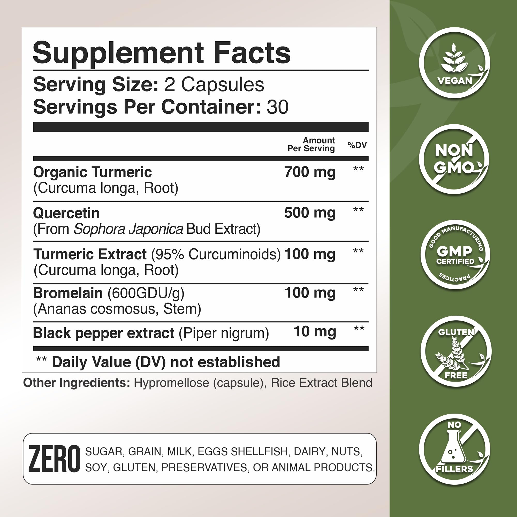 High-Quality, Natural Ingredients: This turmeric supplement is made with carefully selected, high-potency ingredients to ensure maximum purity and efficacy. Organic turmeric powder provides a concentrated source of curcumin, while black pepper extract enhances absorption. Quercetin and bromelain are derived from natural sources, free from artificial additives or fillers. Each batch undergoes rigorous testing to guarantee quality, potency, and consistency in every capsule.