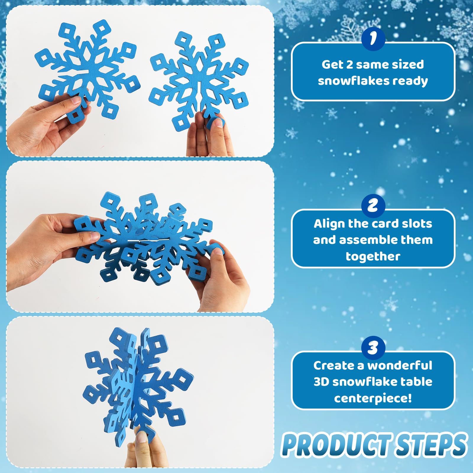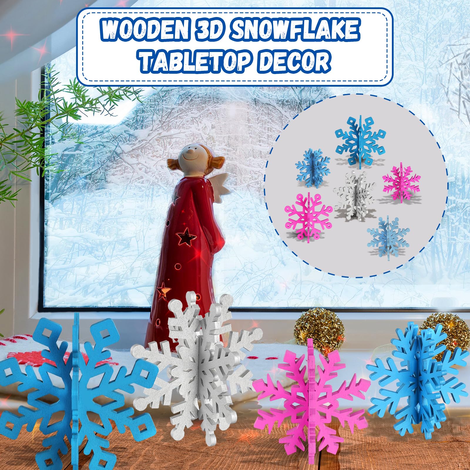 Elegant Snowflake Centerpieces: Turn your holiday table into a festive winter wonderland with our set of 6 wooden snowflake decorations. Including 2pcs sliver wooden snowflakes,4pcs blue wooden snowflakes,2pcs light blue wooden snowflakes and 4pcs fuchsia purple wooden snowflakes in 5 distinct styles and 3 sizes—3.9", 4.7", and 5.5" in diameter—these 3D snowflake table centerpieces are simple to assemble into 6 stunning sets