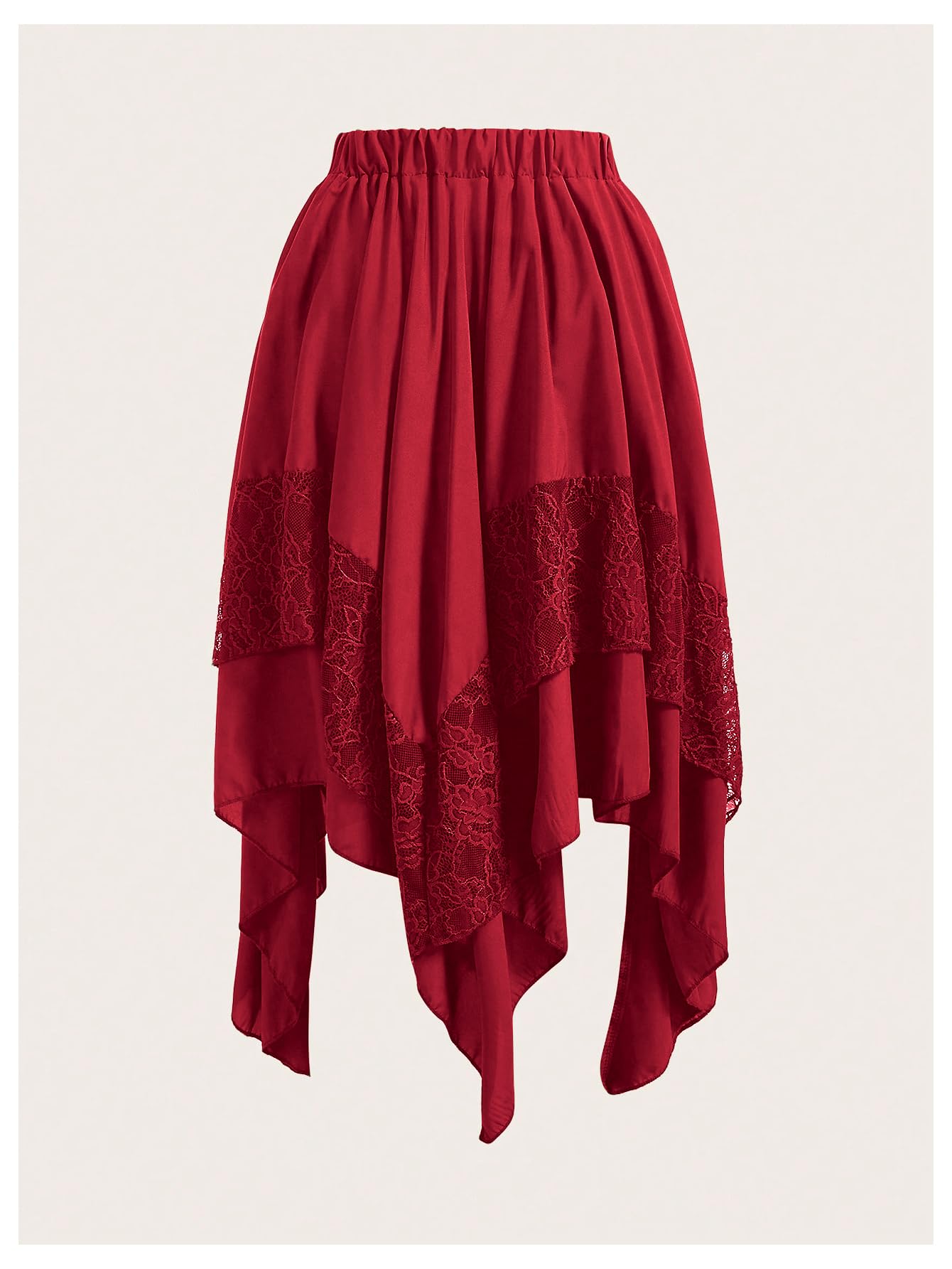 Elastic Waist, Lace Trim, Asymmetrical High Low Hem, A Line, Flowy, Gothic Steampunk Skirt, Casual Midi Skirt