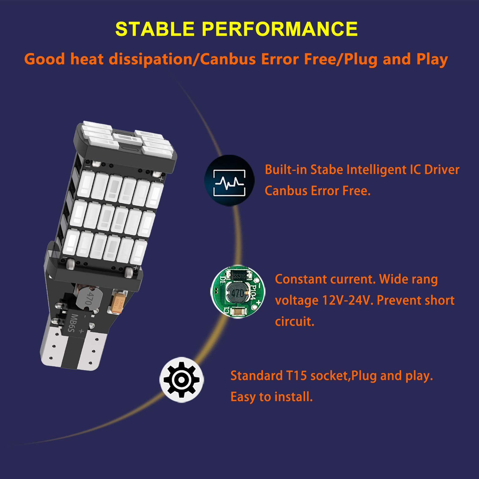【BRILLIANT RED BRIGHTNESS】4pcs Red T15 921 led bulbs with High Power 45SMD 4014 Chipsets ; Color: Brilliant Red; Bulb size: 1.57”x 0.56“,Wide Voltage: 12V-24V; Power: 7w; Lumen: 1500lm; Beam Angle:360°. Much Brighter than original bulbs.