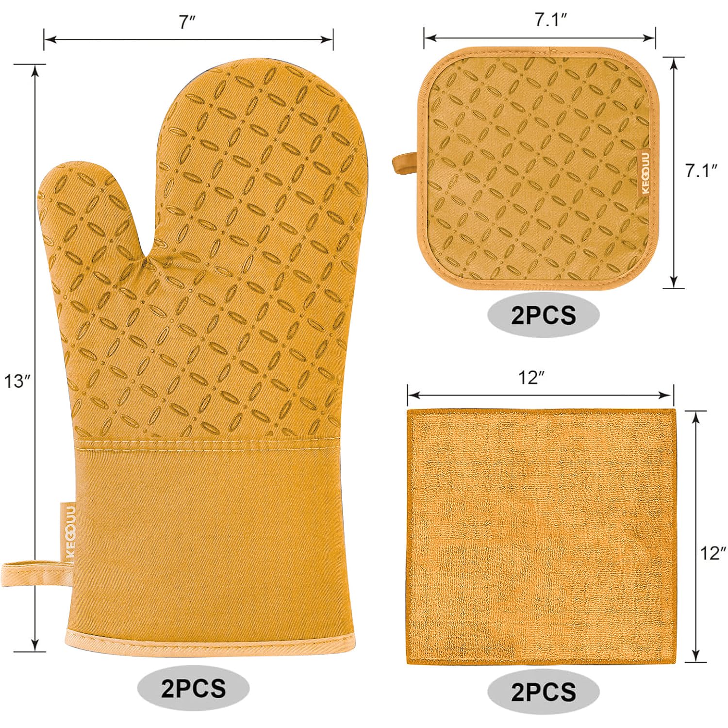 6 PIECE KITCHEN ACCESSORY SETS: Our oven mitts and pot holders set including 2pcs non-slip surface silicone kitchen oven gloves (7X13in), 2pcs pot holders (7X7in) and 2 kitchen towels (12x12in), fit for indoor cooking, baking,BBQ or outdoor grilling. Also the oven mitt set is a perfect ideal kitchen gift for women, men, baker, cooker