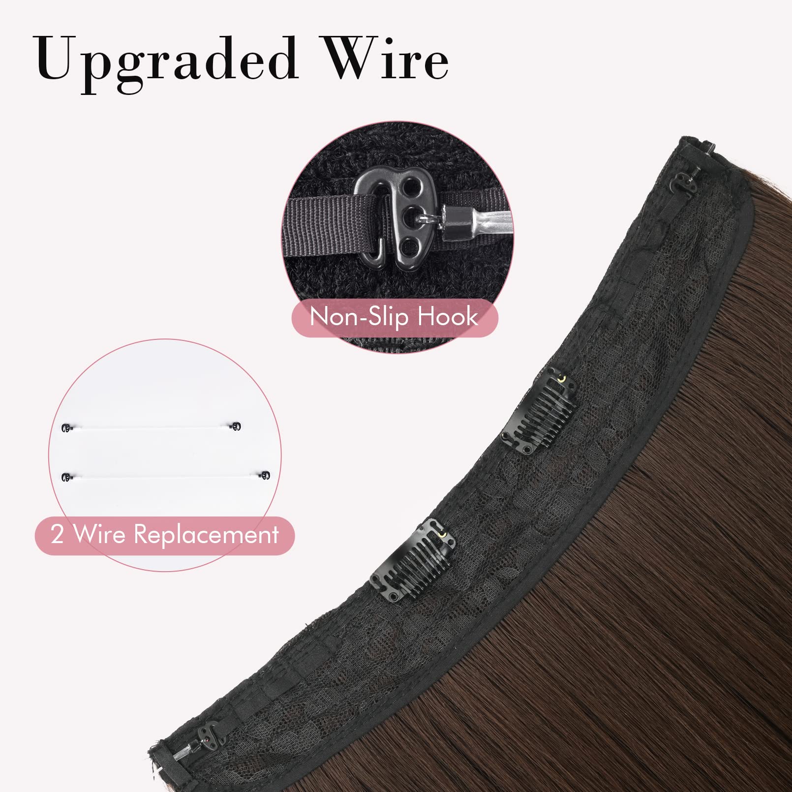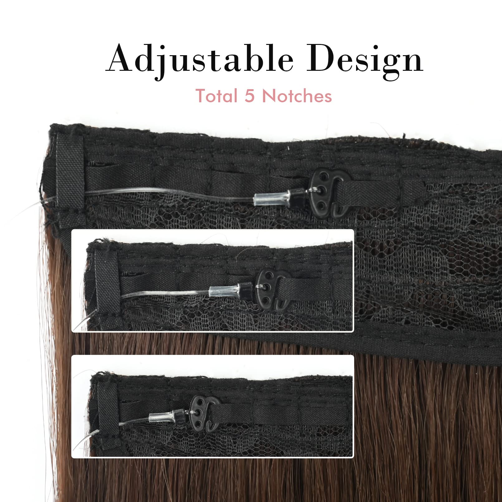 Adjustable Size to Get Perfect Fit: 1.Put the plastic hook into 5 different notches. 2. Total 2PCS wire in different length 8/9inch(1PC attached on hair and 1PC wire replacement)