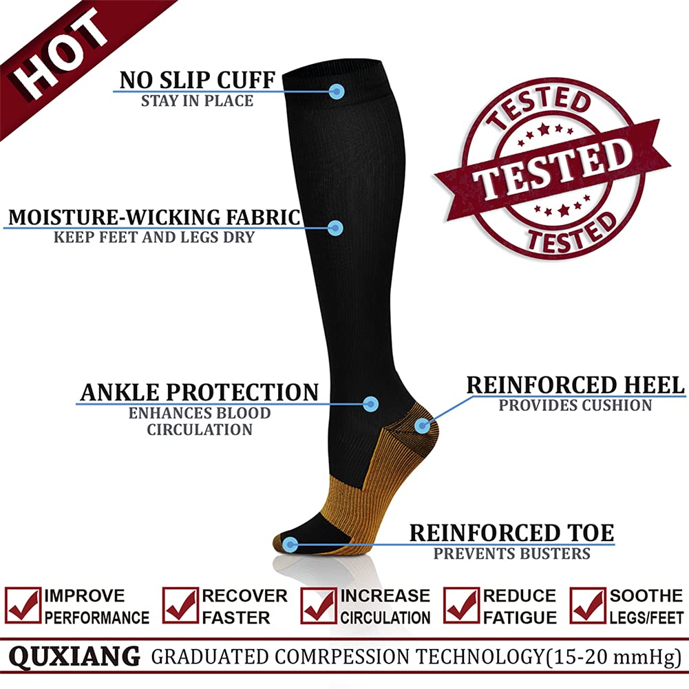 COMPRESSION BENEFITS - QUXIANG Compression socks are designed to promote blood circulation and oxygen flow preventing fatigue and helps in muscle recovery. Whether you are an athlete, sportsperson, teacher, flight crew, receptionist, office worker, pregnant, recovering patient, nurturing mother, elderly, our socks are universally suitable for all work.