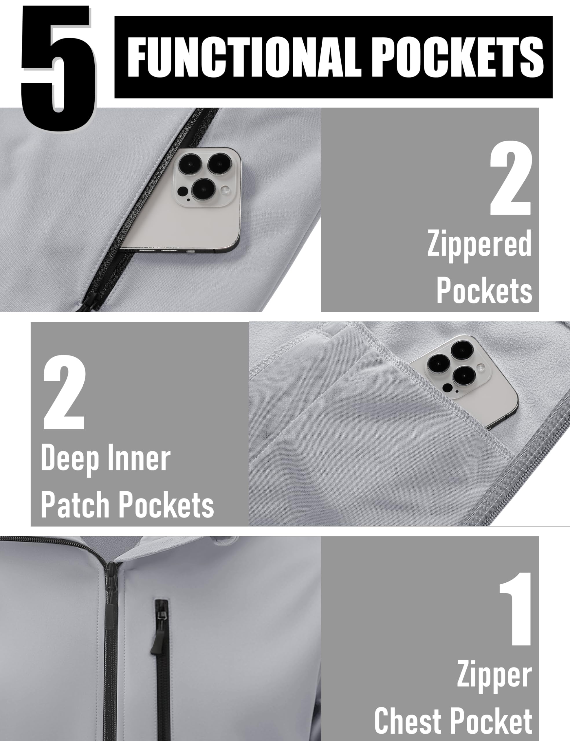 5 FUNCTIONAL UTILITY POCKETS - Men's tactical hiking jacket includes 2 inside roomy pockets, 2 zipper hand pockets and 1 zipper chest pocket, providing great convenience for storing money, keys, phone, wallet etc