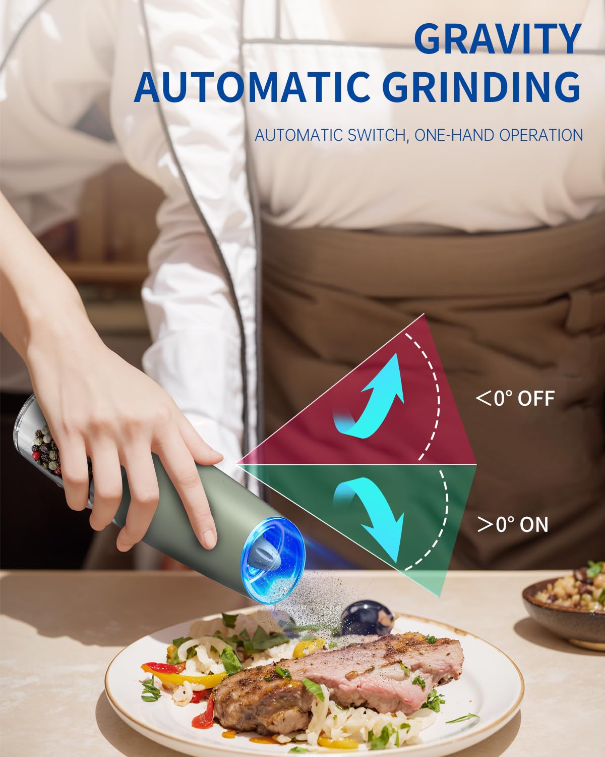 【Automatic Operation】The gravity salt and pepper grinder set electric uses advanced technology for easy one-handed operation. Simply flip the grinder to enjoy freshly ground spices without the need for manual grinding or pressing buttons. This salt and pepper grinder is a good helper for kitchens, restaurants, parties and outdoor picnics
