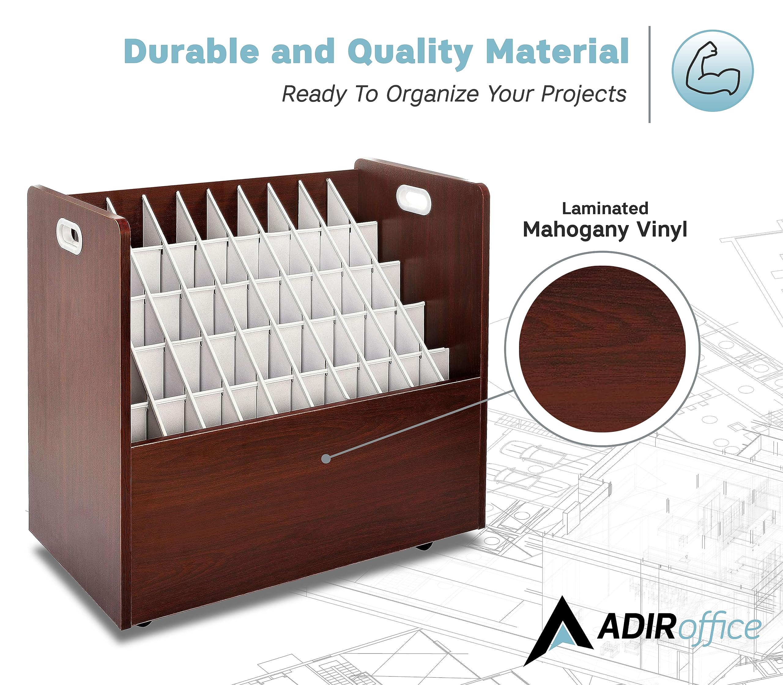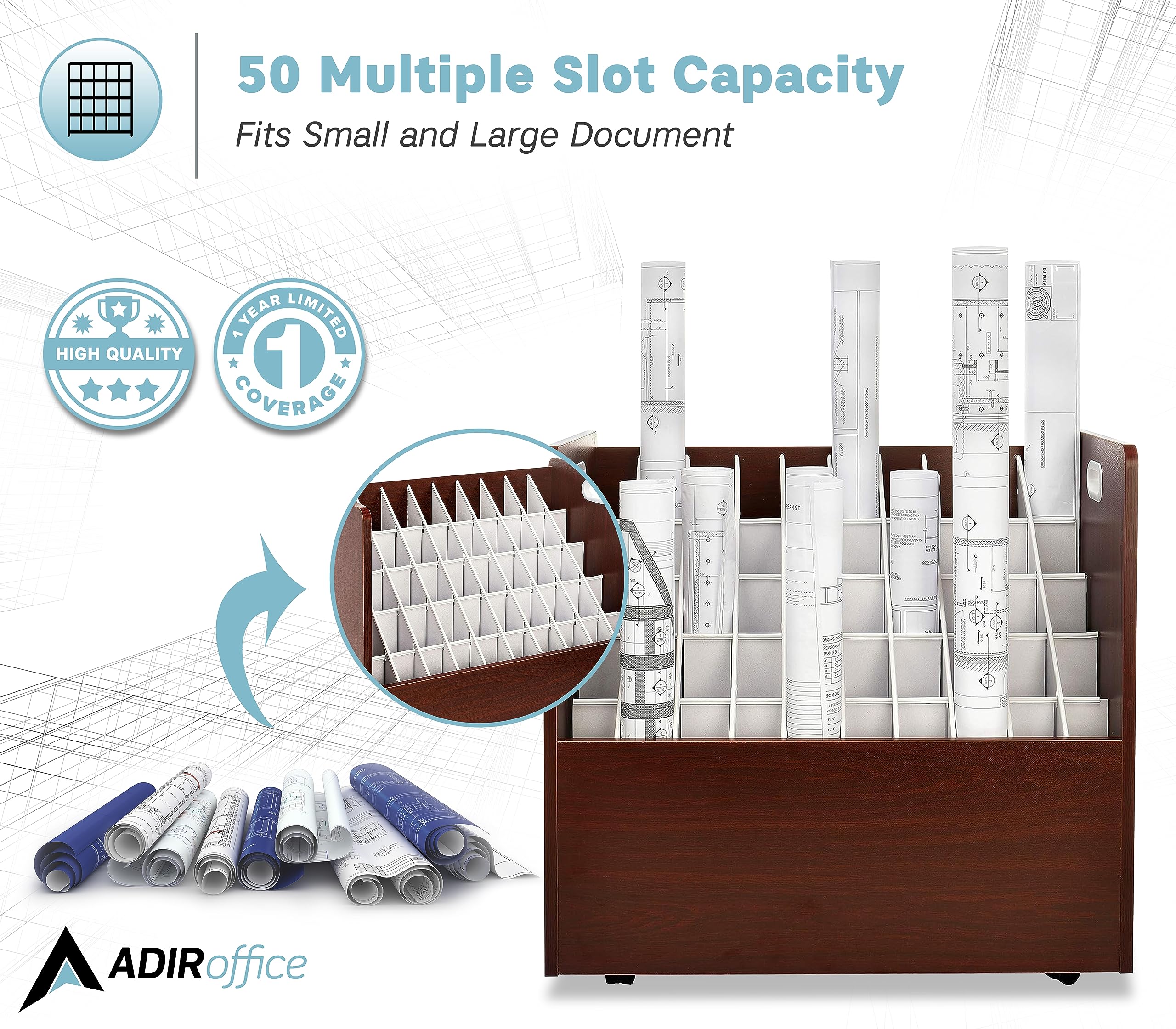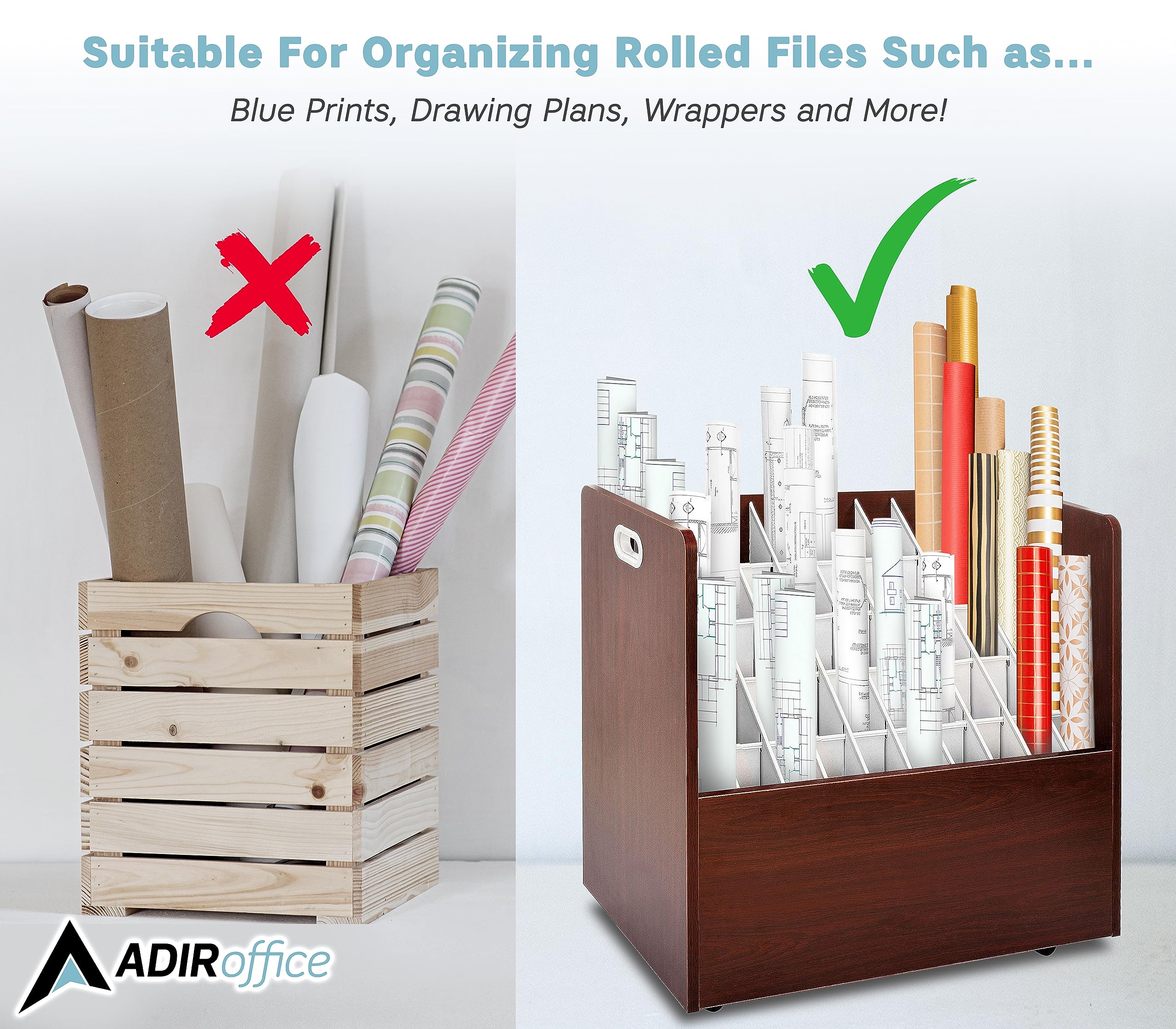 Versatile use: Adir’s rolled files organizer serves multiple purposes. It can be used as a blueprint storage cabinet, rolled poster storage, vinyl roll holder, map storage cart, architectural plan storage, and more.