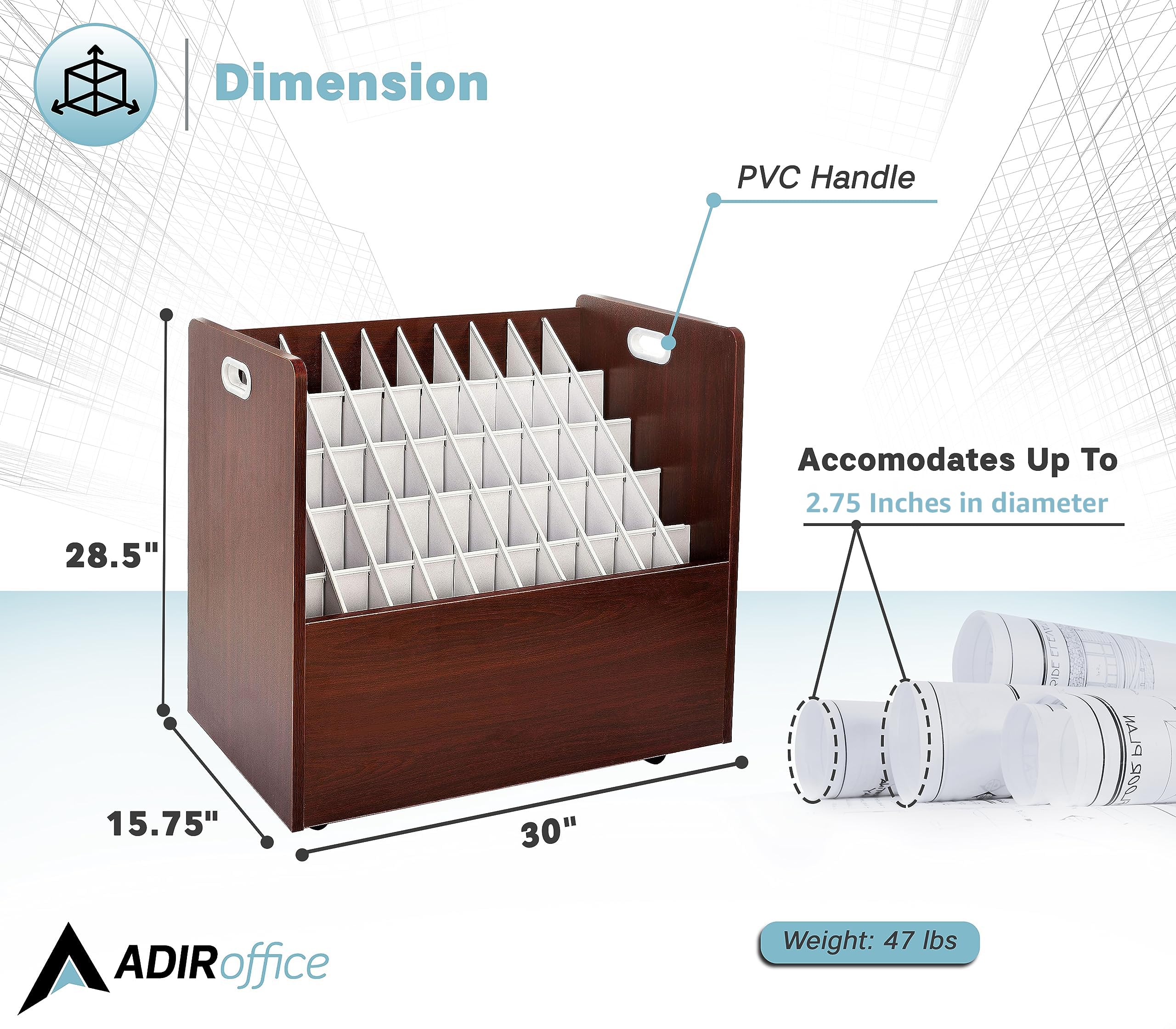 Stylish and functional: The Adir’s plans organizer combines aesthetic appeal with practical design. Its sleek vinyl laminate finish complements any decor. With a 50-pound weight capacity and sturdy construction, this rolled document storage is built to last.