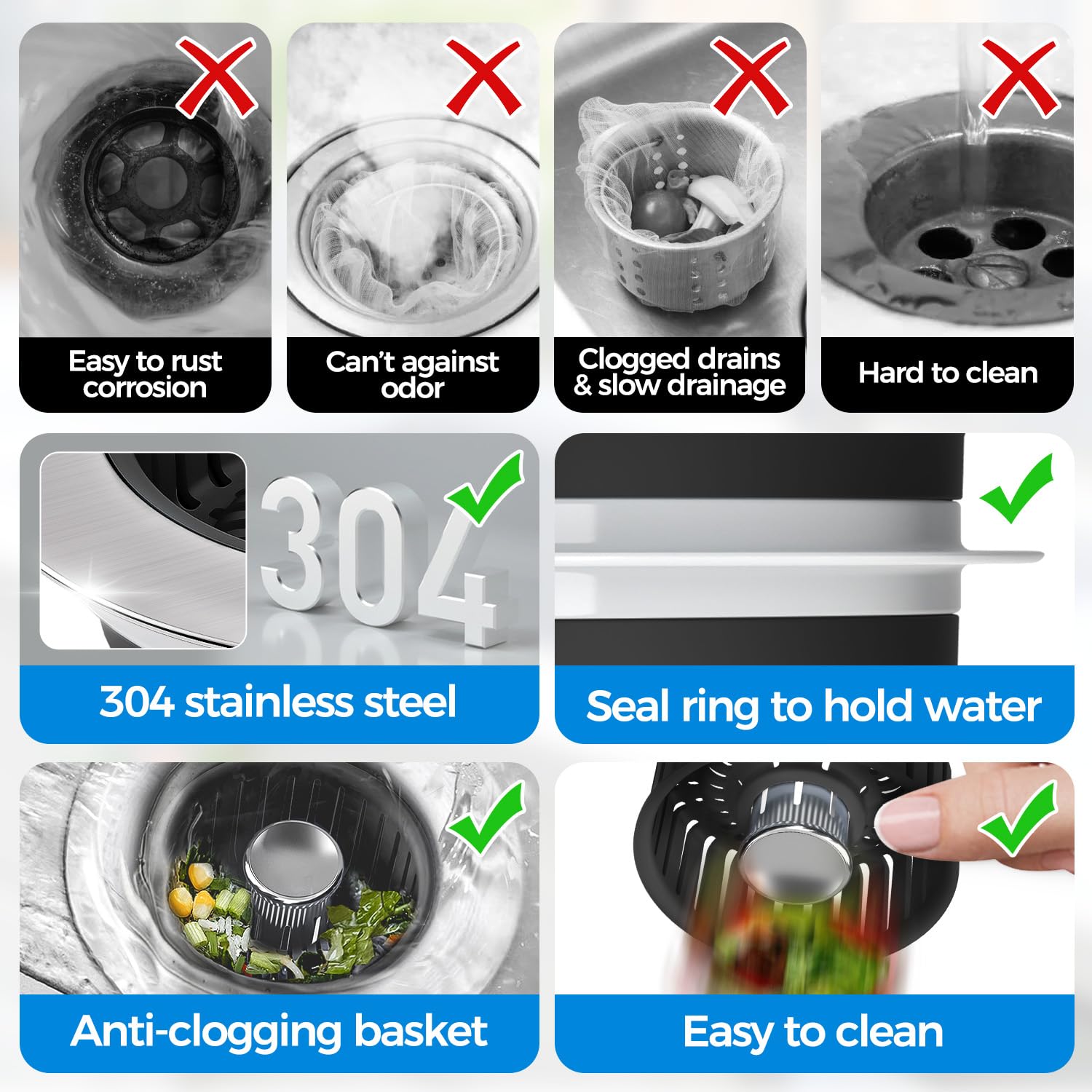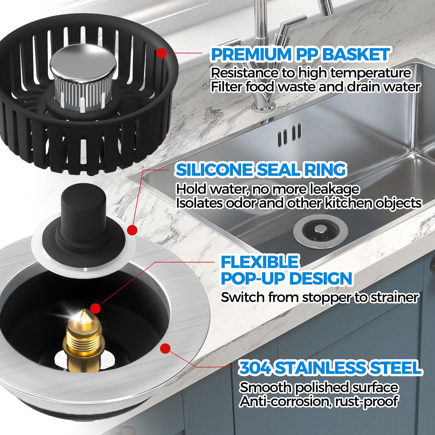 【Upgraded 3 in 1 Kitchen Sink Drain Strainer】Our kitchen sink strainer, combines sink drain strainer, kitchen sink stopper and odor isolation together. Press down the pop up button to store water for washing, press again to drain water while catching food waste or scrap from going down the drain. A reliable anti clogging helper and a must have kitchen sink installation parts