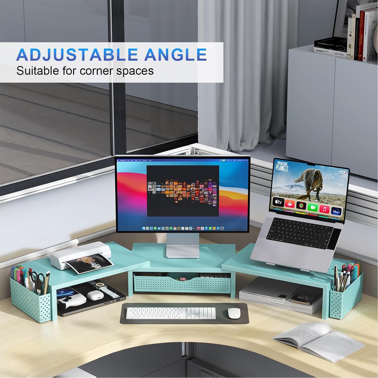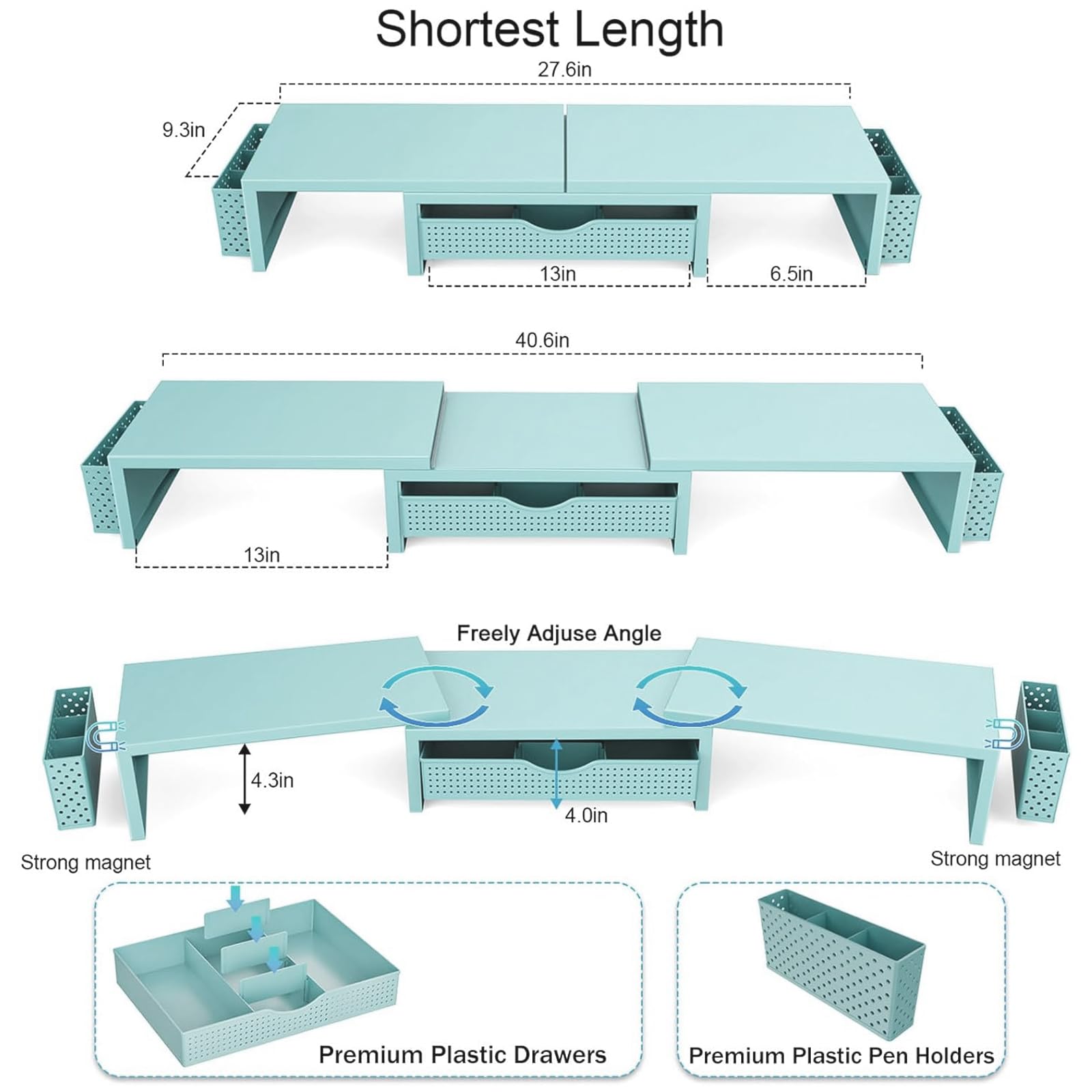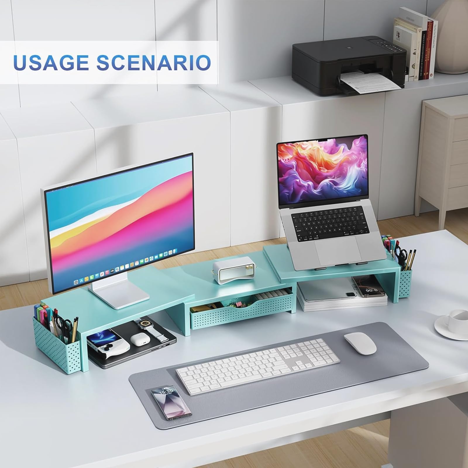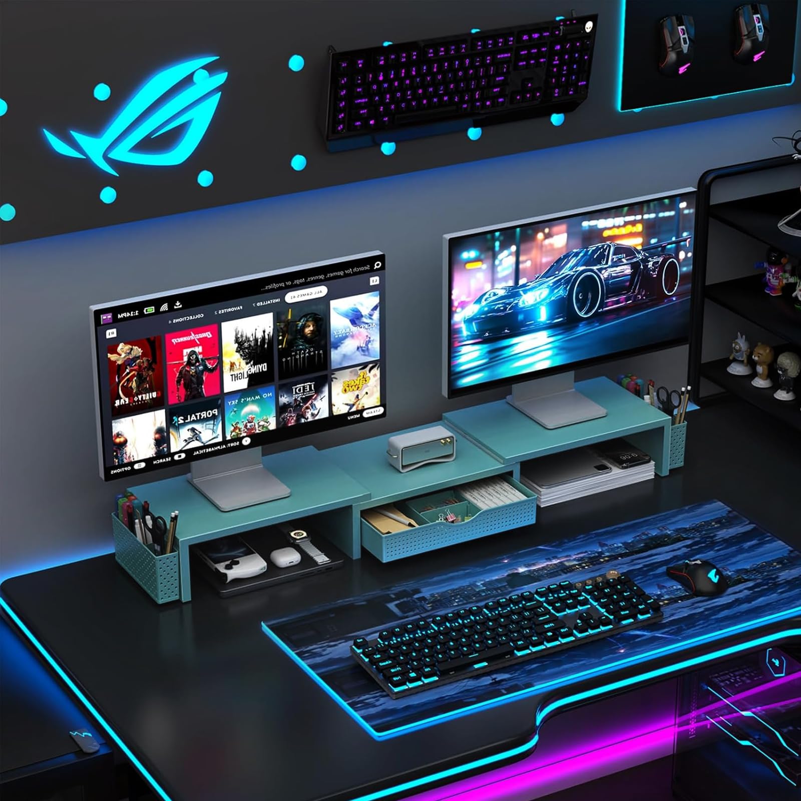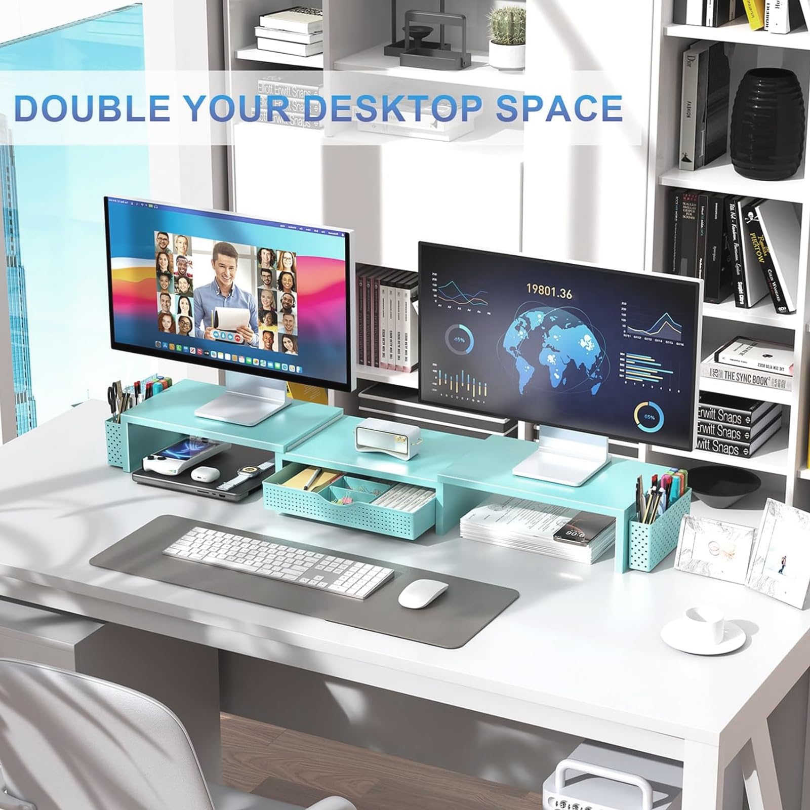 gianotter Dual Monitor Stand Riser, Desk Organizer With Drawer and 2 Pen Holders, Monitor Stand for Desk, Office Decor Essentials (Blue)