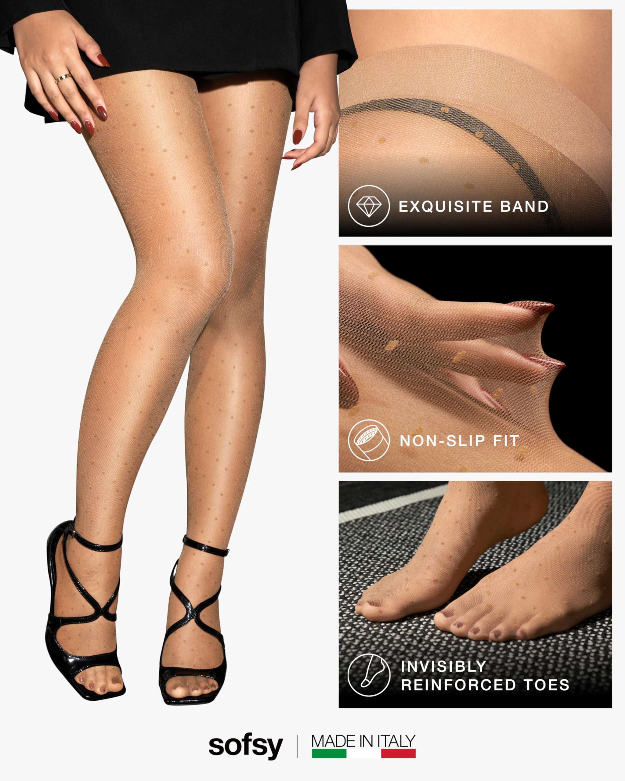 Made in Italy, Designed to Seduce: These sheer-to-waist pantyhose are crafted using silky-soft yarns and a playful polka dot pattern. They add just the right amount of allure to any outfit—whether for date night, office wear, or a festive occasion.