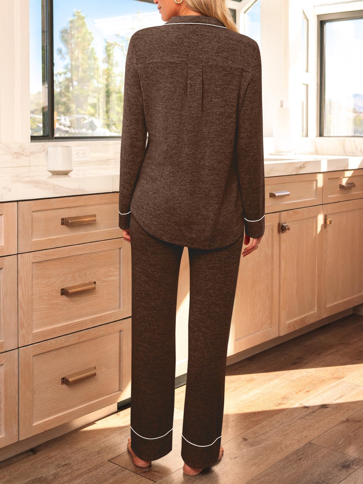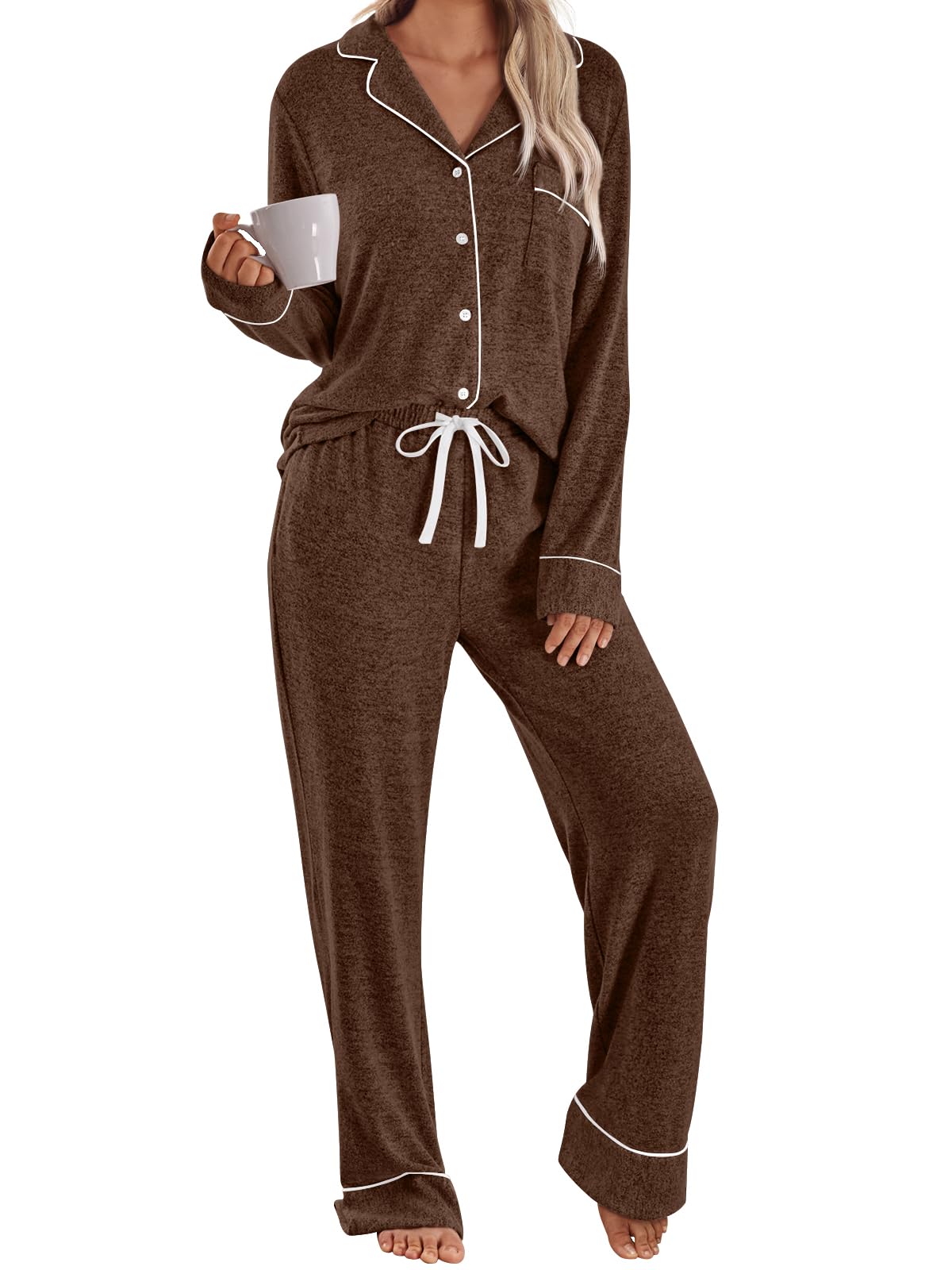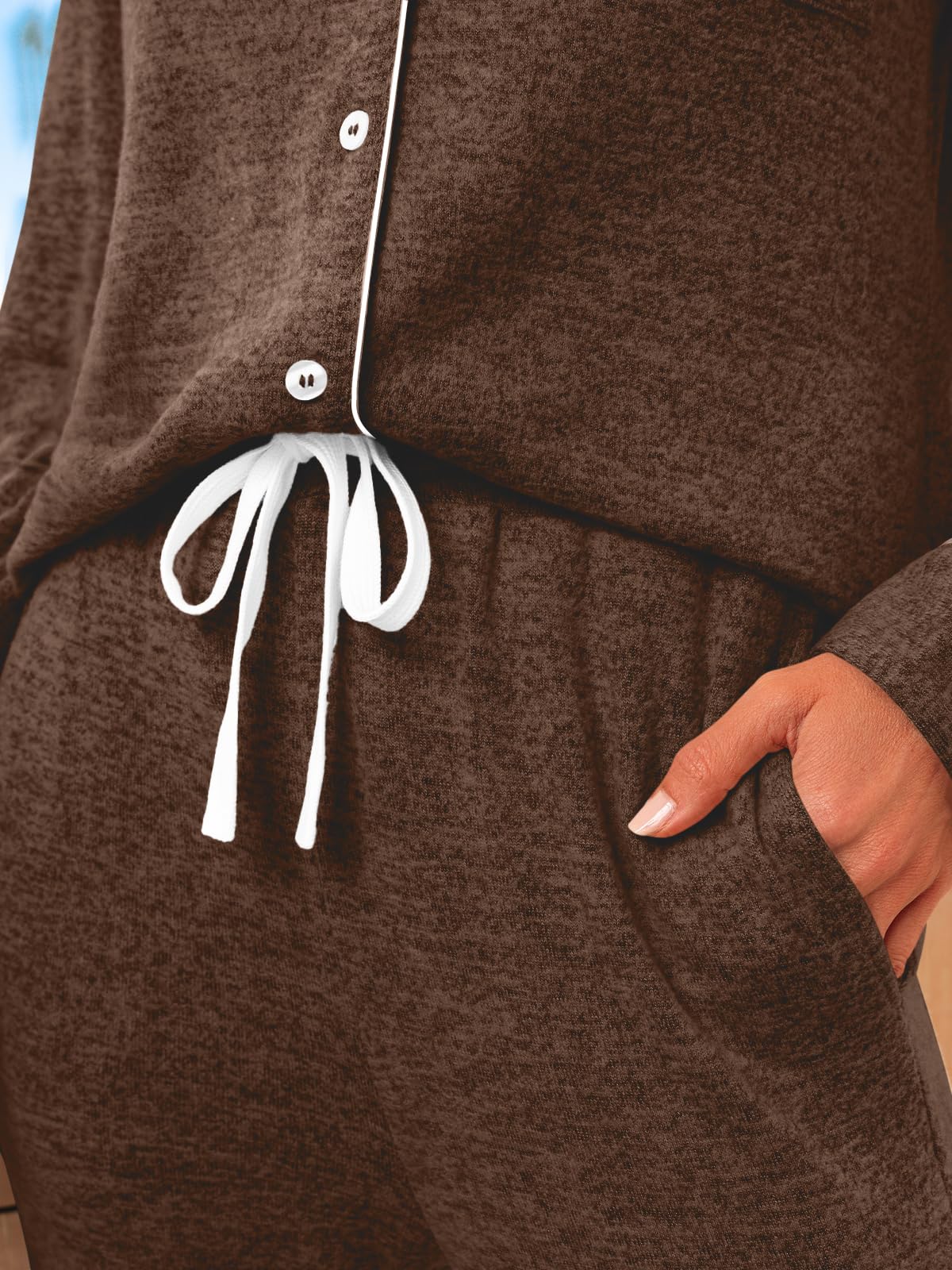 Fashion Design: Womens casual long sleeve v neck button down pajamas sets, pants with drawstring elastic design