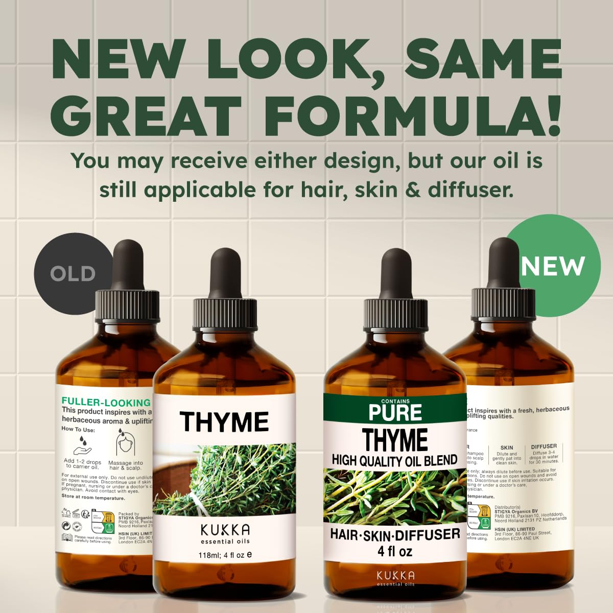 Thyme essential oil for hair. A must-have for hair care, thyme oil for hair may promote the appearance of fuller-looking hair. Craft a customized thyme hair oil by mixing a few drops with carrier oil before massaging into the hair and scalp.