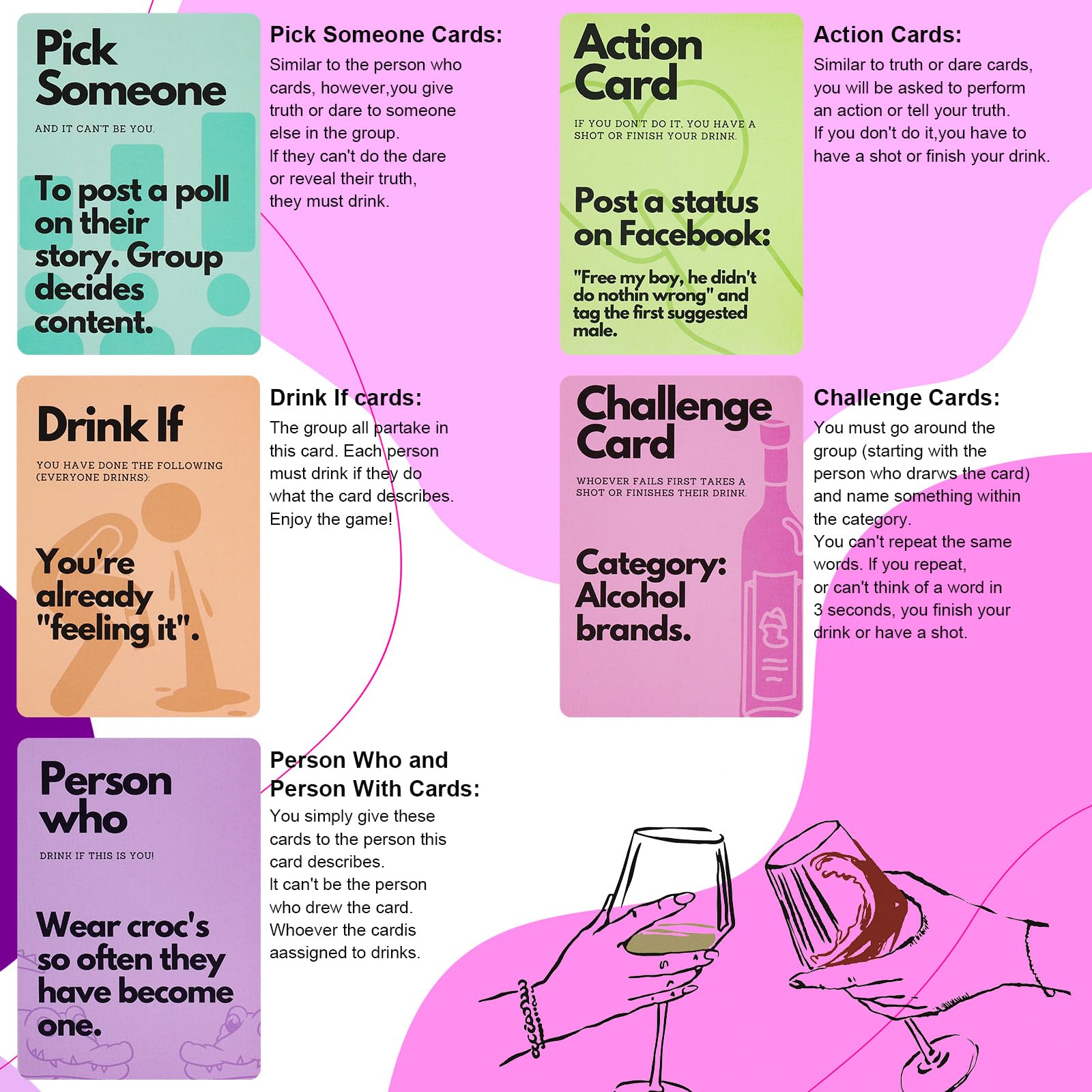Simple to Learn and Play: Shuffle the cards and place them face down in the middle of your group. Each player takes it in turns to select a card, read it aloud to the group and follow what the card requires/describes. Great for 2-8 players, ages 21+.